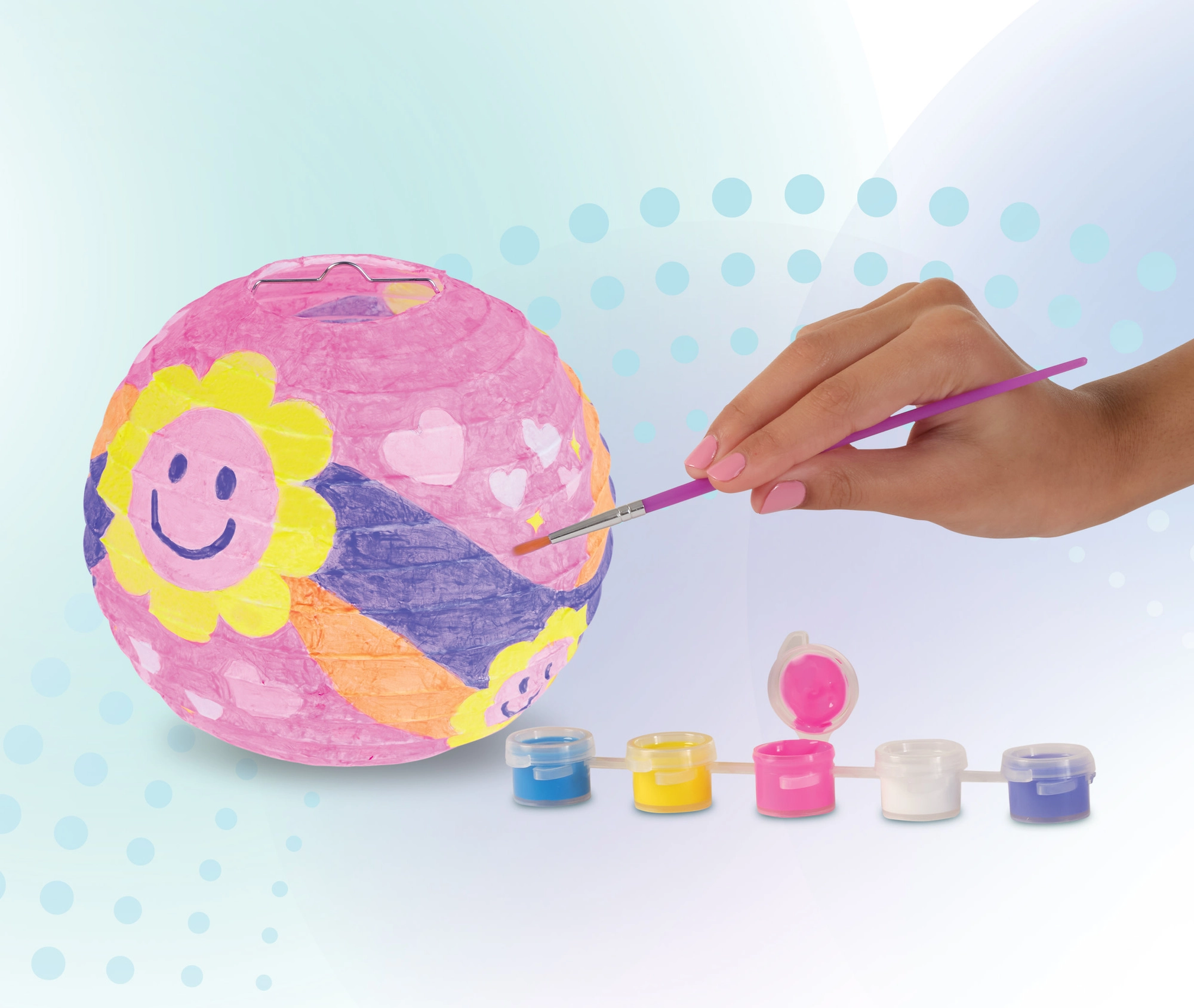 Pachetul conține tot ce aveți nevoie: felinar, 5 culori acrilice, pensulă, extensor cu cârlig și instrucțiuni. Culorile pot fi amestecate liber pentru a crea modele originale, astfel încât fiecare felinar va fi complet unic. Activitate ideală pentru petreceri, nopți în pijama, aniversări și pentru după-amiezi creative acasă.