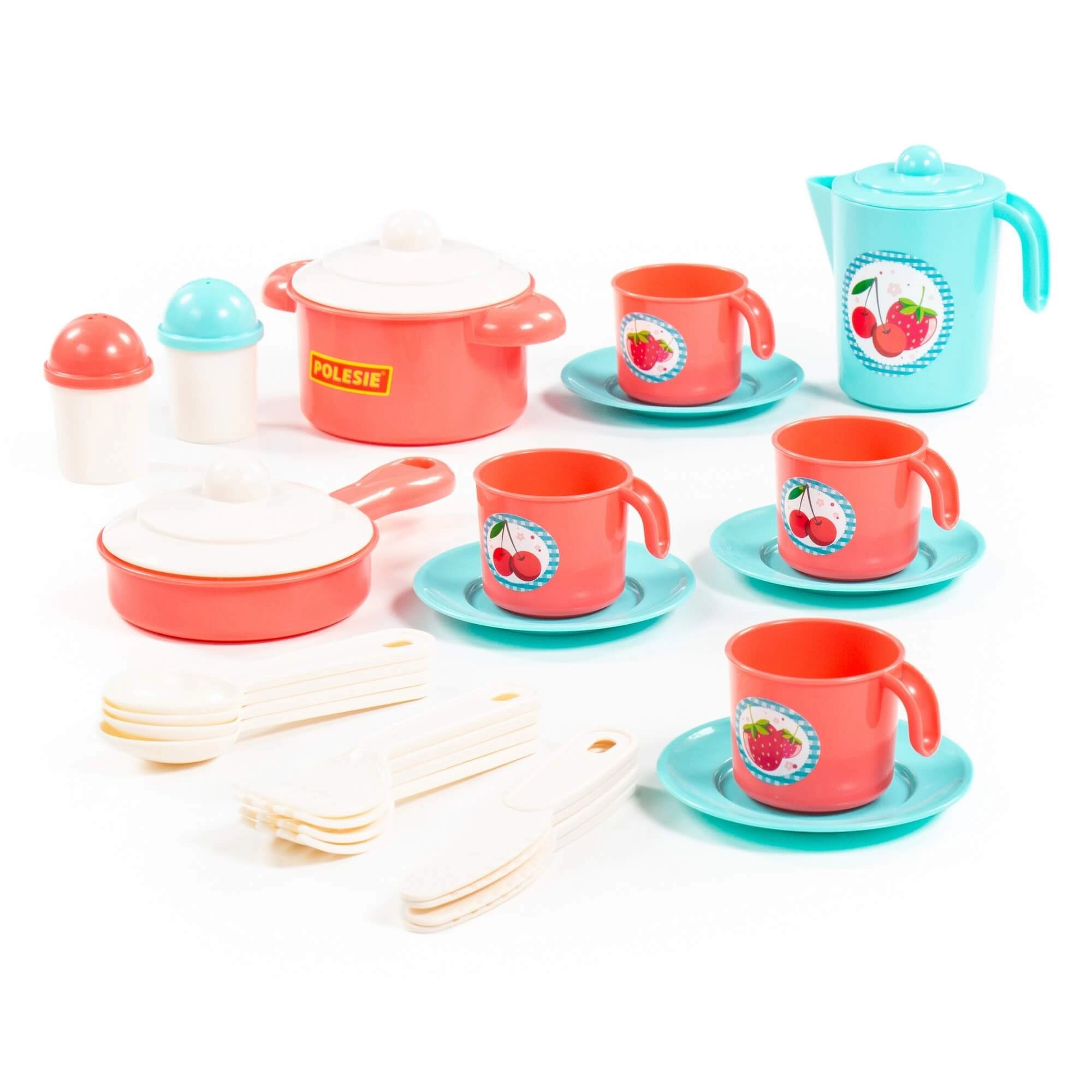 Cu setul Nastenka, copiii se vor bucura de un joc realist de gătit și servit la masă. Setul include ceainic, oală cu capac, tigaie cu capac, cești cu farfuriuțe, solniță și piperniță, precum și un set de lingurițe și ustensile de bucătărie în culori atrăgătoare coral și turcoaz, cu motive vesele de fructe.