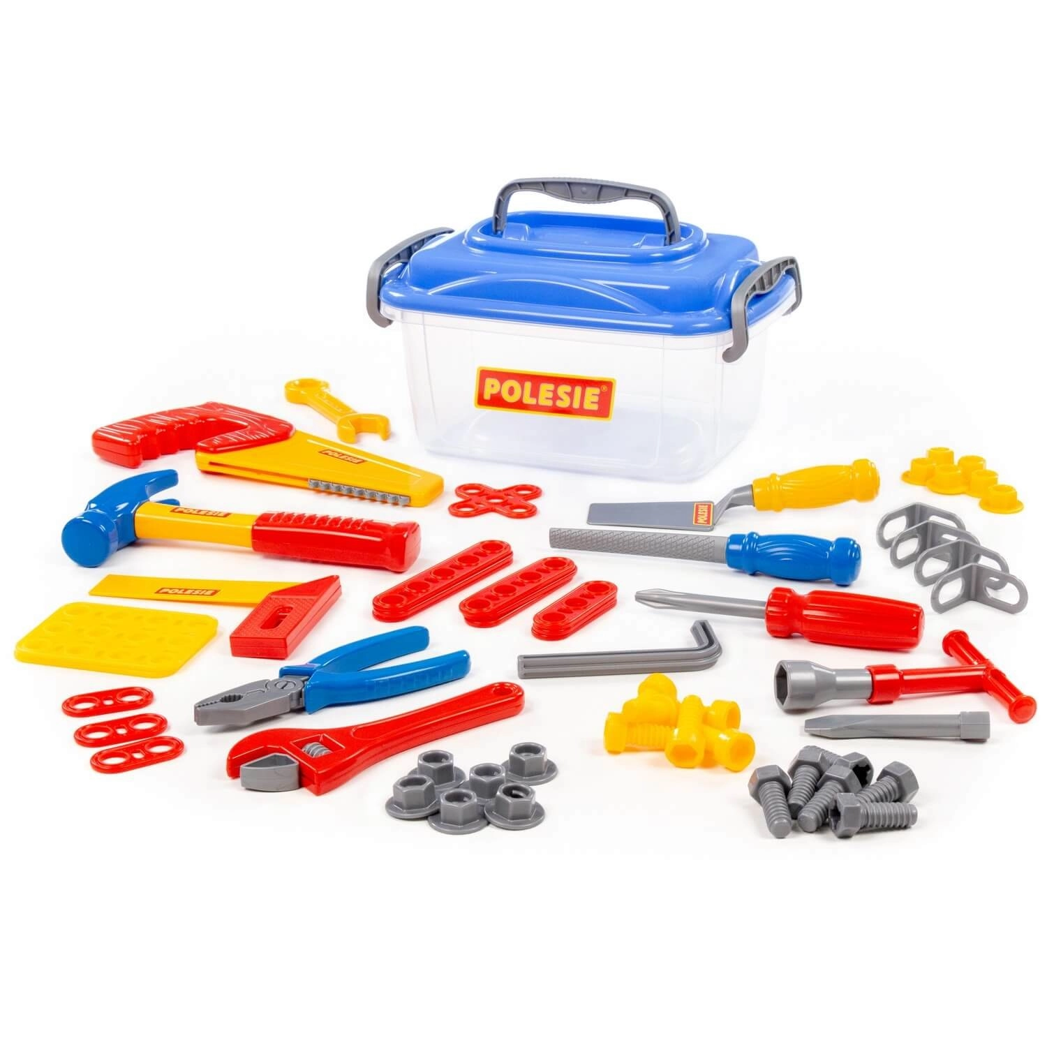 Descoperă jocul distractiv și sigur de mic meșter cu setul de unelte POLESIE cu 58 de piese într-o cutie practică. Copiii se vor bucura de instrumente realiste precum ciocan, fierăstrău, șurubelnițe cu biți, chei și clește, iar datorită șuruburilor, piulițelor și elementelor de îmbinare pot asambla propriile construcții. Setul dezvoltă motricitatea fină, coordonarea, gândirea tehnică și creativitatea – totul organizat clar într-o cutie portabilă rezistentă.