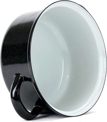 Castron compact emailat BELIS Standard cu volum de 0,8 l și diametru de 14 cm, ideal pentru încălzirea zilnică a apei, laptelui sau pentru fiert ouă. Emailul rezistent, cu interior granit alb și exterior negru cu puncte albe, se curăță ușor, este igienic și potrivit pentru inducție și toate celelalte tipuri de aragazuri.
