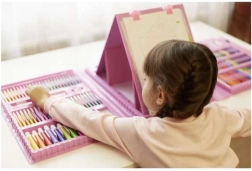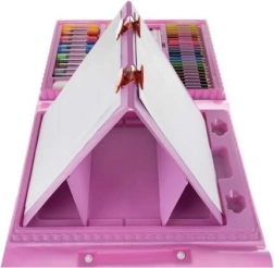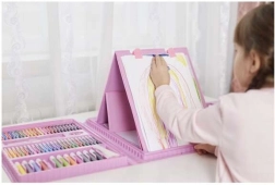 Setul include 208 piese, inclusiv markere, creioane pastel și ceară, acuarele și multe alte instrumente.
