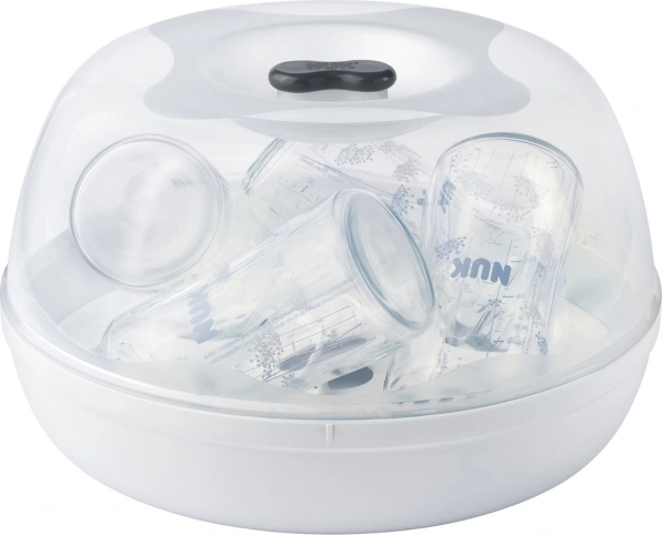 NUK Micro Express Plus este un sterilizator cu abur pentru cuptorul cu microunde, care asigură dezinfectarea fiabilă a biberoanelor și accesoriilor pentru bebeluși în câteva minute. Datorită suportului inteligent, poate găzdui până la 4 biberoane de 300 ml cu gât larg și le menține în poziția corectă pentru o uscare eficientă. Capacului transparent și noului sistem de blocare le datorează o utilizare sigură și clară.