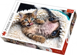 Aceste puzzle-uri cu 1000 de piese ilustrează o pisicuță veselă. După asamblare, formează o imagine cu dimensiunile 68x48 cm. Asigură calitate înaltă, culori clare și siguranță la asamblare folosind hârtie calandrată care respinge lumina și culori ecologice alimentare.