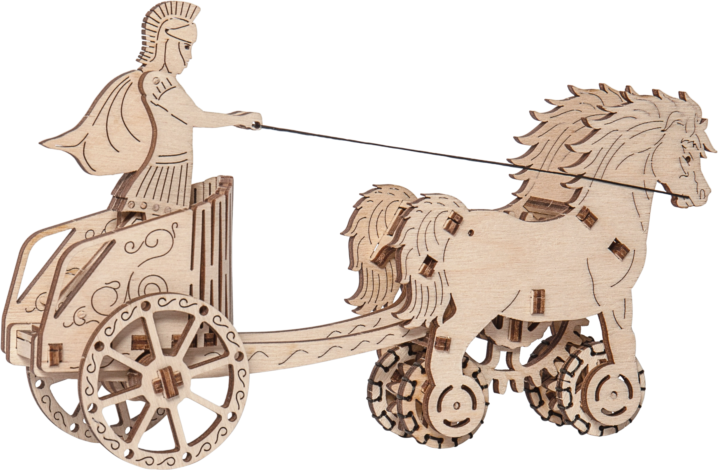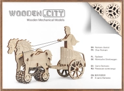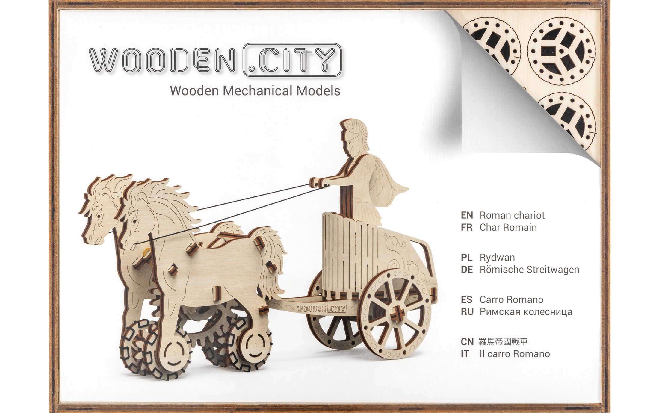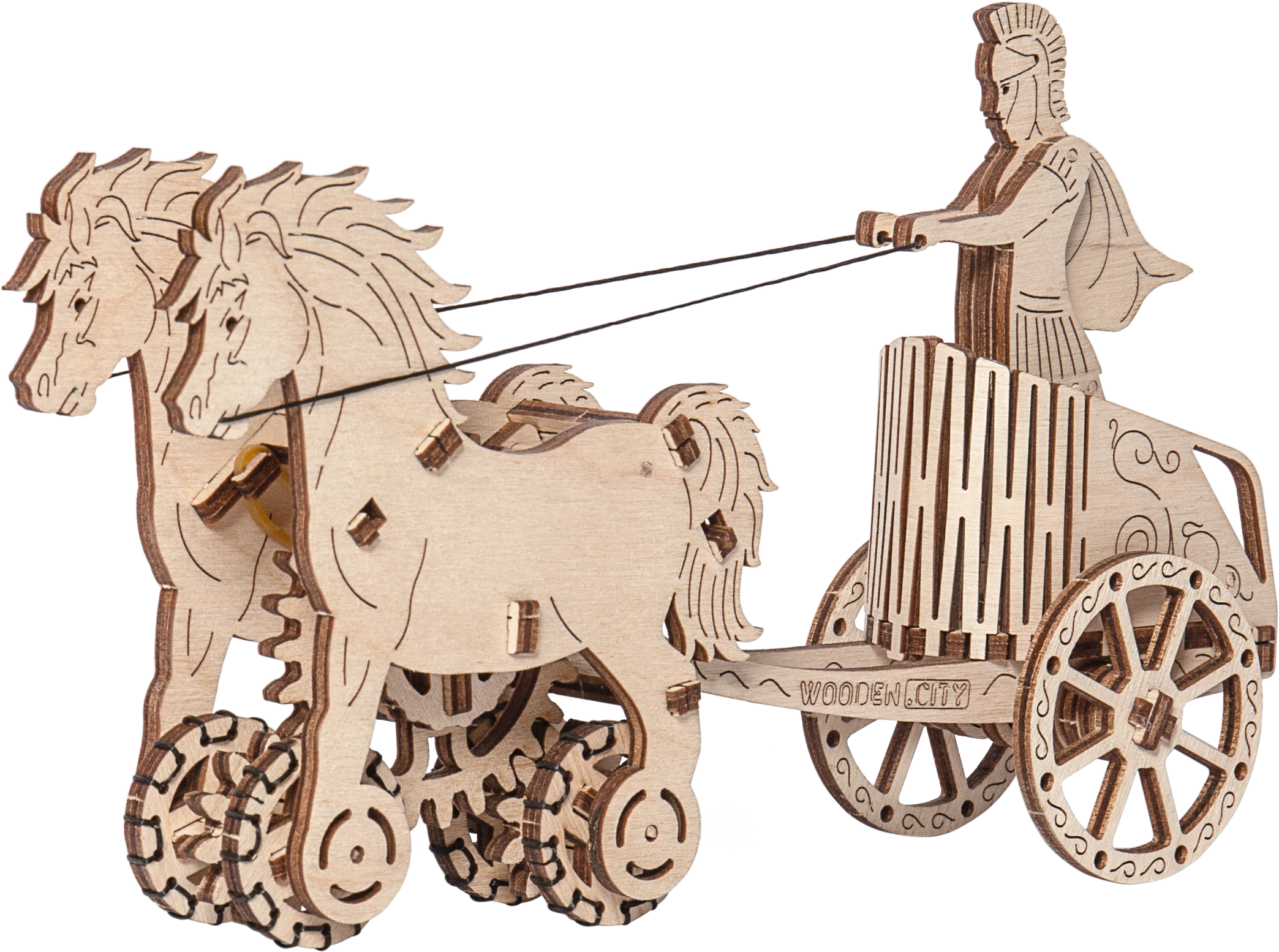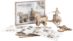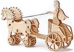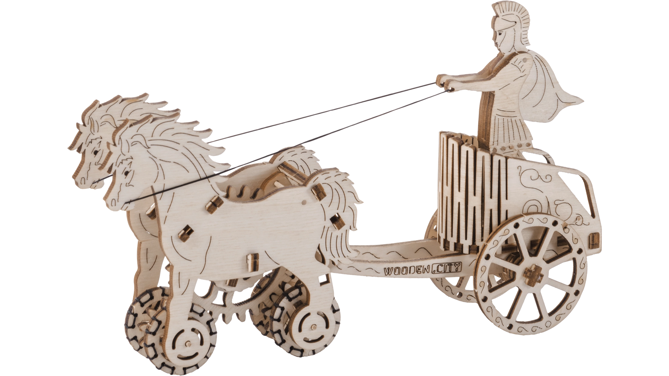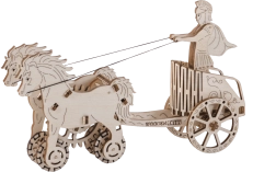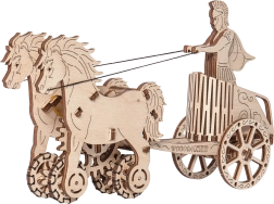 În numele imperiului. Kitul pentru construcția carului roman cu atelaj dublu, realizat din placaj. În carul redat fidel este plasată o figurină detaliată a unui călăreț roman. Datorită mecanismului cu armare, modelul poate rula; la pornire poate reproduce ridicarea atelajului și parcurge până la 1 metru. Organizați curse cu alte modele Wooden City! Echipat cu un ghid detaliat de asamblare. Principalele caracteristici: 74 piese tăiate cu precizie, dificultate redusă la asamblare, modelul final este capabil să se deplaseze singur.