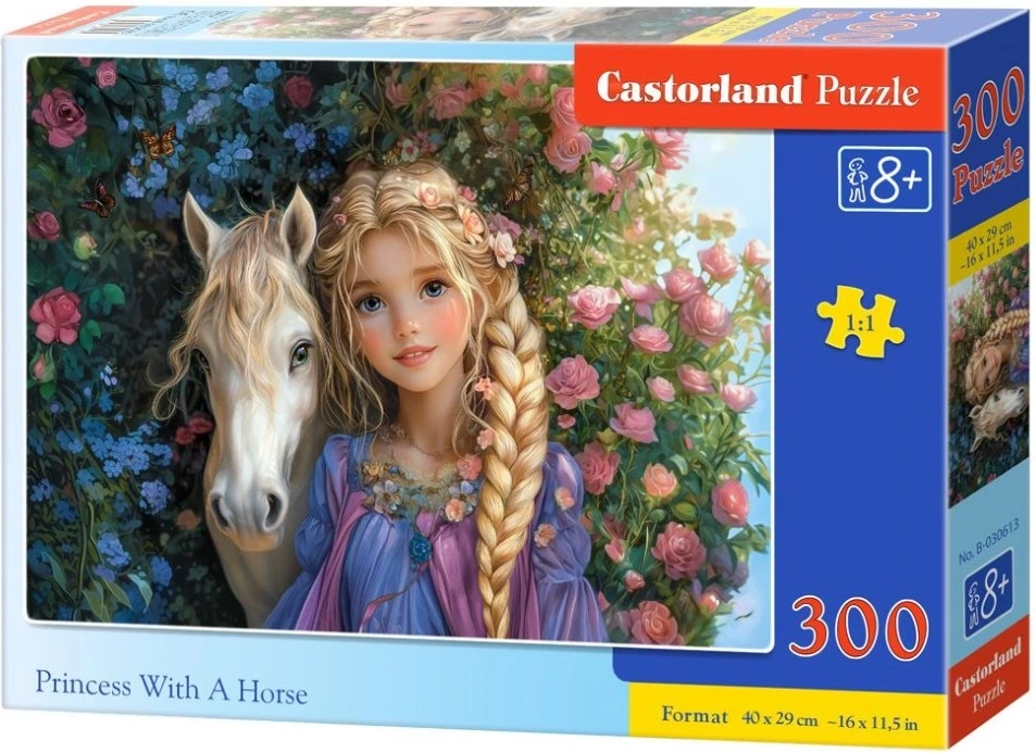 Descoperă farmecul lumii de basm cu puzzle-ul CASTORLAND. Puzzle-ul cu motivul prințesei și calului oferă 300 de piese pentru momente plăcute în familie și pentru antrenarea răbdării. După asamblare, puzzle-ul are dimensiunea de aprox. 40 × 29 cm – o mărime ideală pentru înrămare sau expunere în camera copilului.
