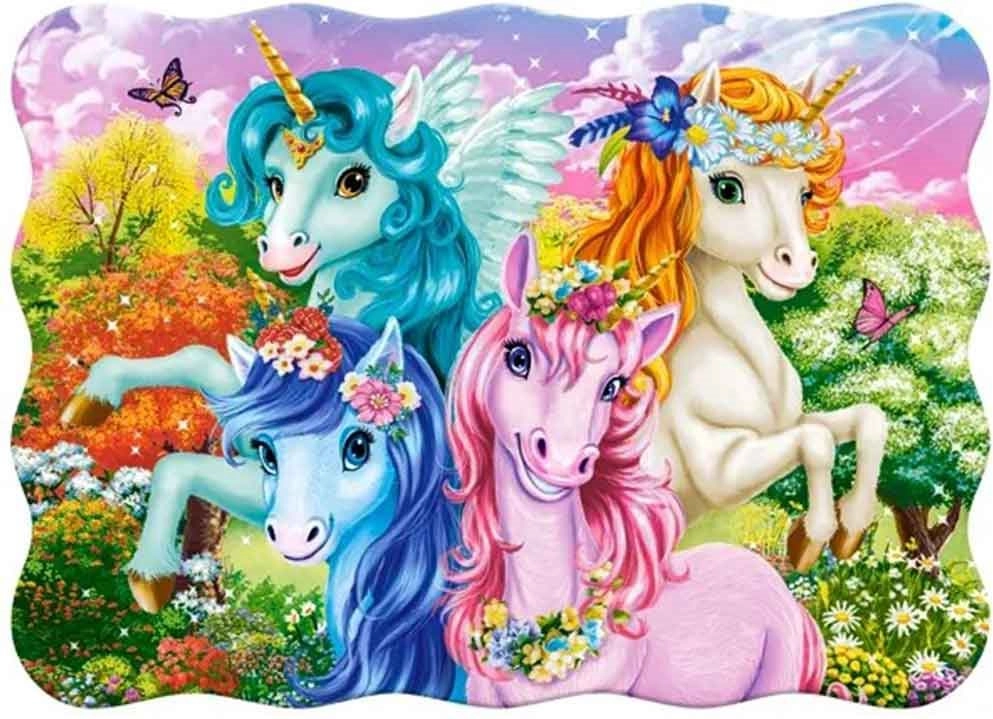 Descoperă lumea fanteziei cu puzzle-ul Castorland Unicorni. Piesele mari de aproximativ 5 cm ușurează prinderea și asamblarea pentru mânuțele copiilor, iar marginea modelată ajută la orientarea în imagine. Puzzle-ul final are dimensiunea de aprox. 32 × 23 cm – mărimea ideală pentru primele puzzle-uri.