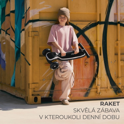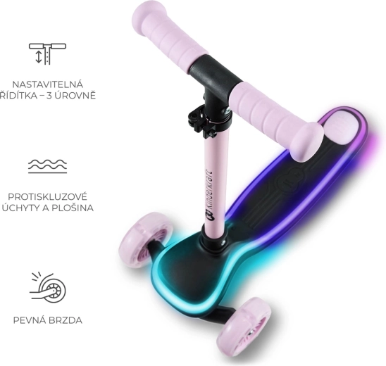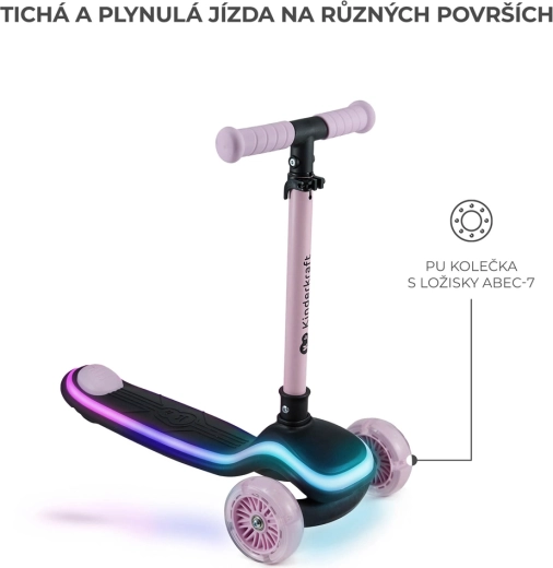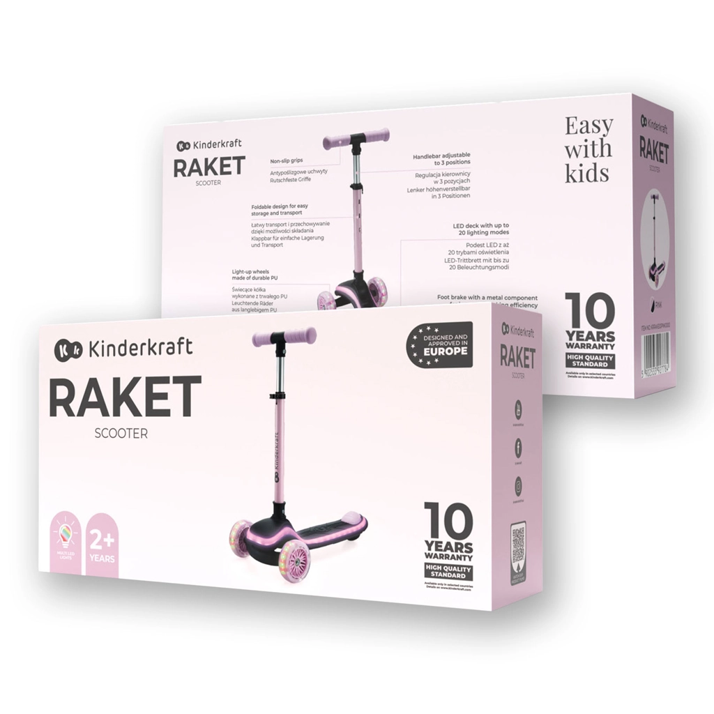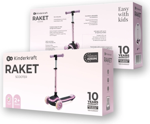 Trotineta pentru copii KINDERKRAFT Raket Pink este concepută pentru micii rideri care învață o deplasare stabilă și sigură. Datorită virării prin înclinare, copiii își antrenează natural echilibrul, în timp ce platforma lată și joasă oferă o poziție sigură. Iluminarea LED a platformei cu până la 20 de moduri și roțile RGB luminează fiecare ieșire și îmbunătățesc vizibilitatea după lăsarea serii.