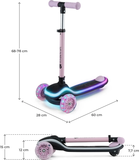Descoperă bucuria deplasării cu trotineta tricoloră pentru copii KINDERKRAFT Raket Pink. Direcția prin înclinare dezvoltă echilibrul și coordonarea, iar platforma iluminată LED și roțile RGB luminoase sporesc vizibilitatea și distracția. Datorită ghidonului reglabil, plierii rapide și roților silențioase din PU cu rulmenți ABEC-7, este alegerea ideală pentru primele experiențe de mers.