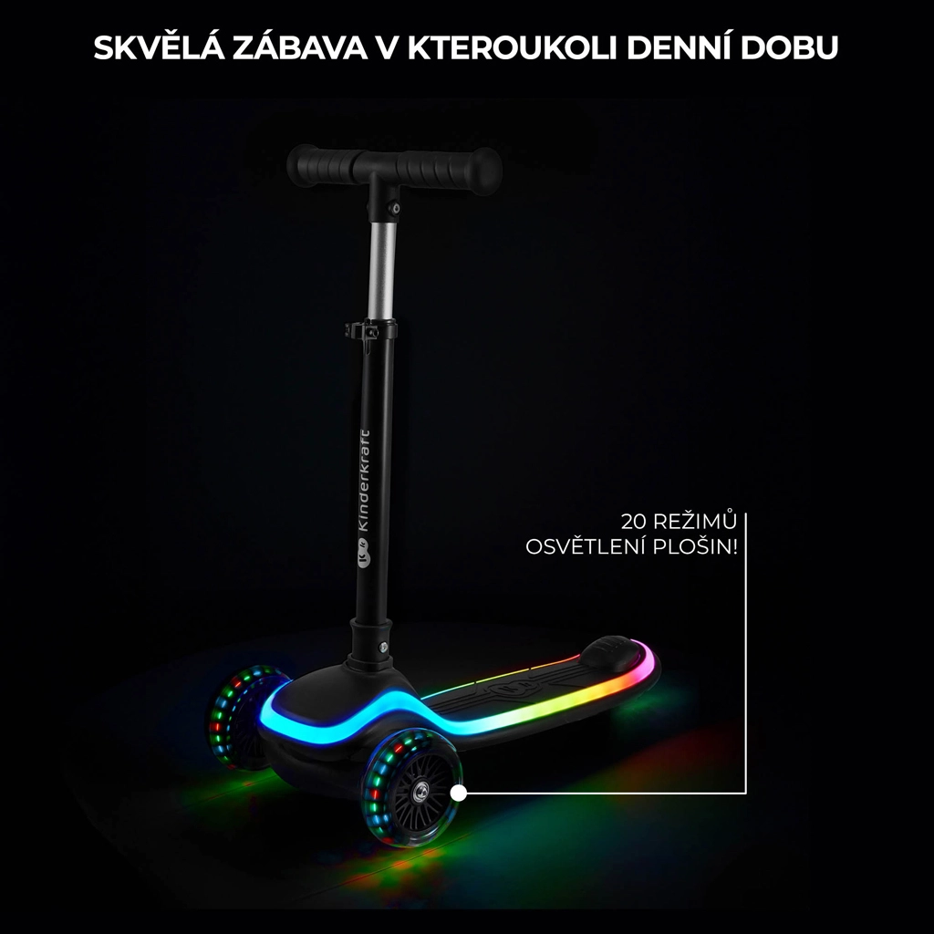 Până la 20 de moduri de iluminare pe platformă, iar roțile luminoase asigură ca micuțul să fie mai vizibil și după lăsarea serii – iar mersul devine și mai distractiv.