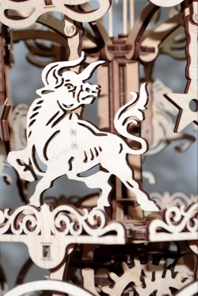 Fiecare piesă este tăiată cu precizie pentru îmbinare lină și un aspect impresionant. Ornamentele și motivele animale accentuează estetica caruselului clasic.