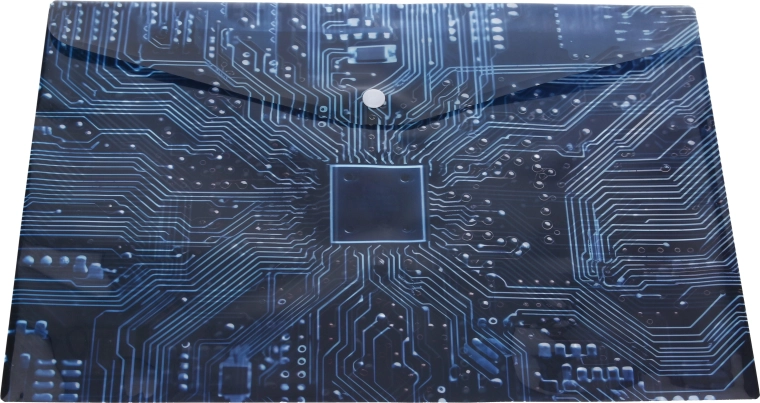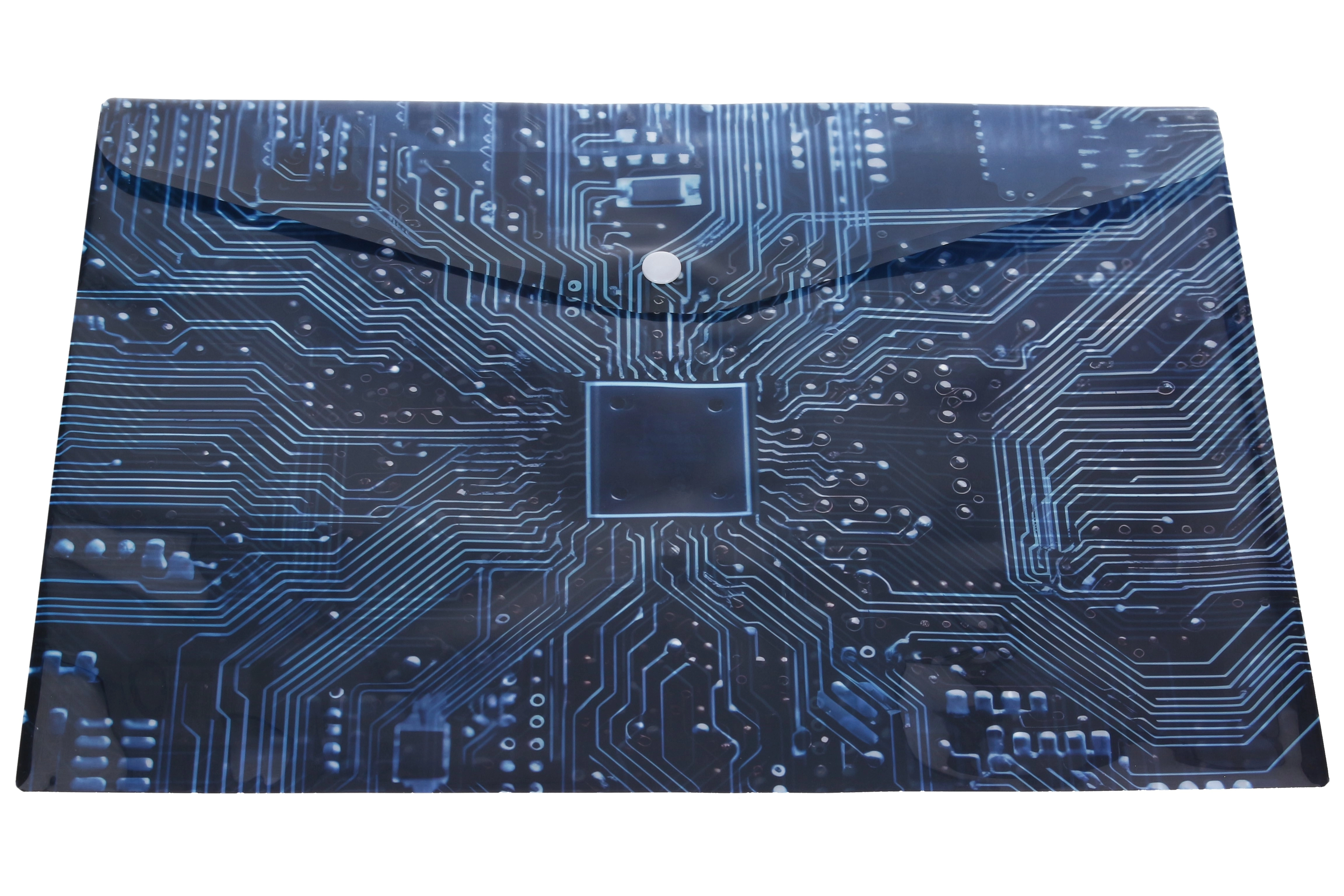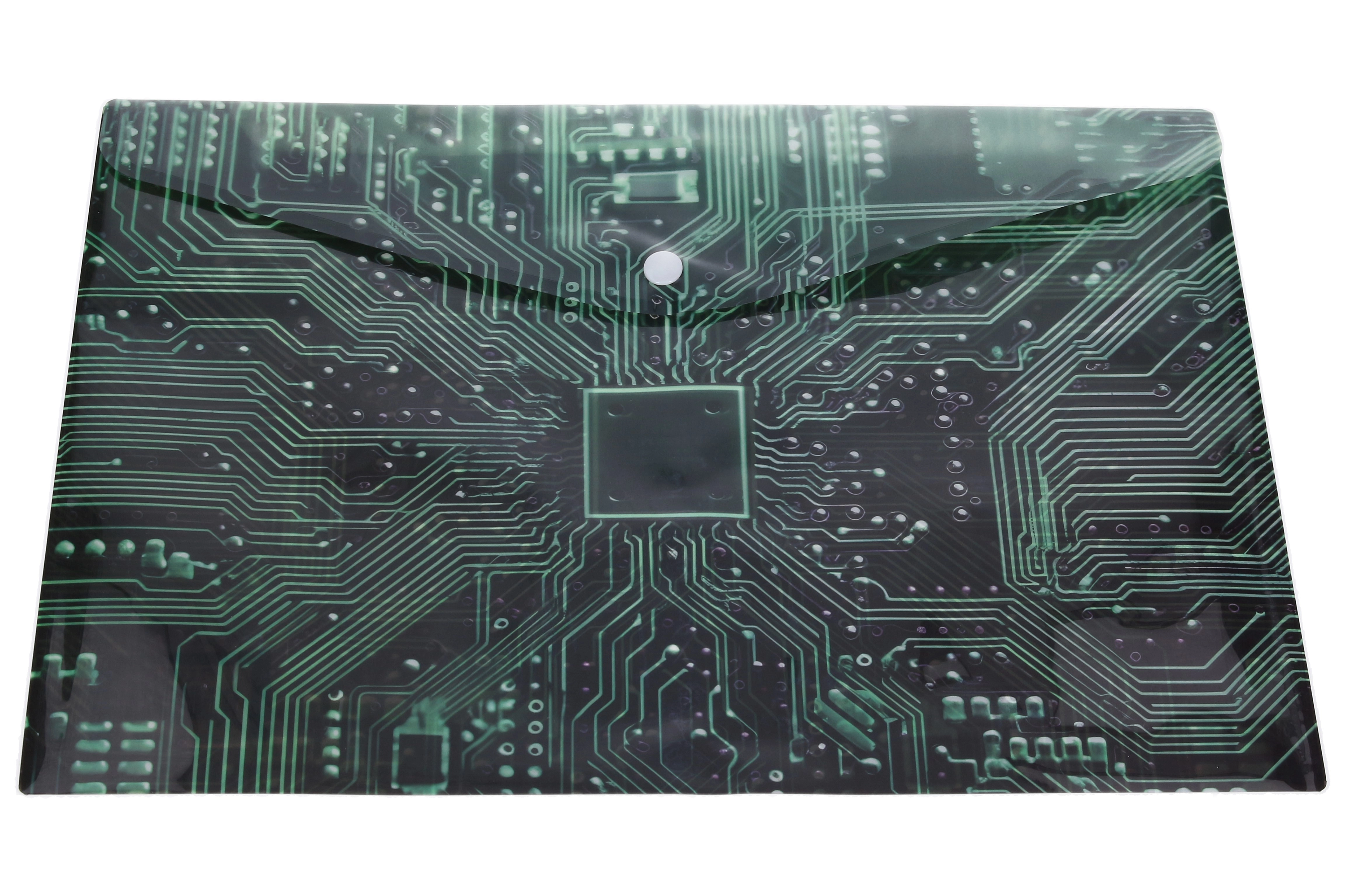 Mapă compactă din plastic cu capsă, cu dimensiunile 10,5 × 7,5 cm, ideală pentru documente mici, notițe și carduri. Oferă închidere fiabilă cu capsă, plastic rezistent și model stilizat de placă de bază în patru variante de culoare. Păstrați ordinea în geantă și pe birou și protejați conținutul de praf și îndoire.
