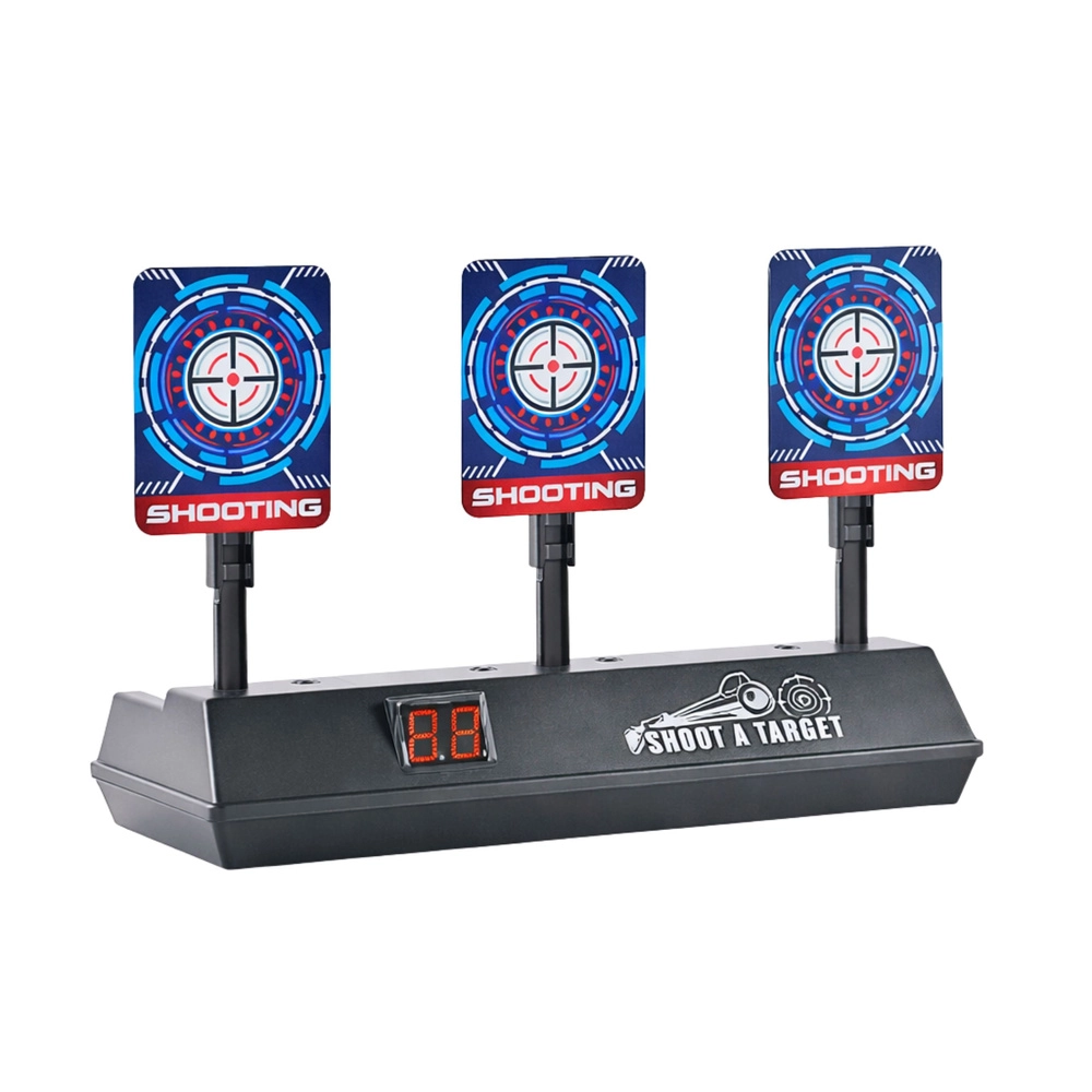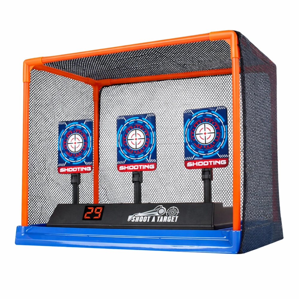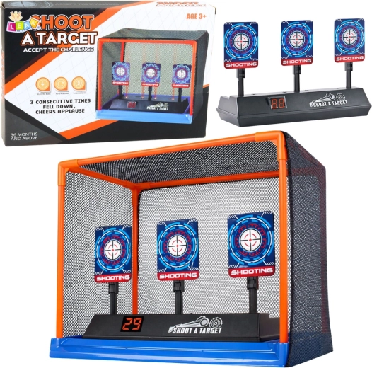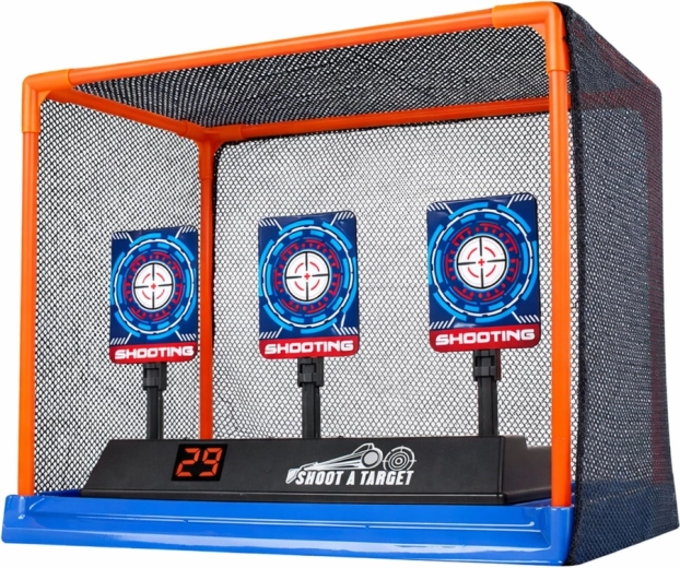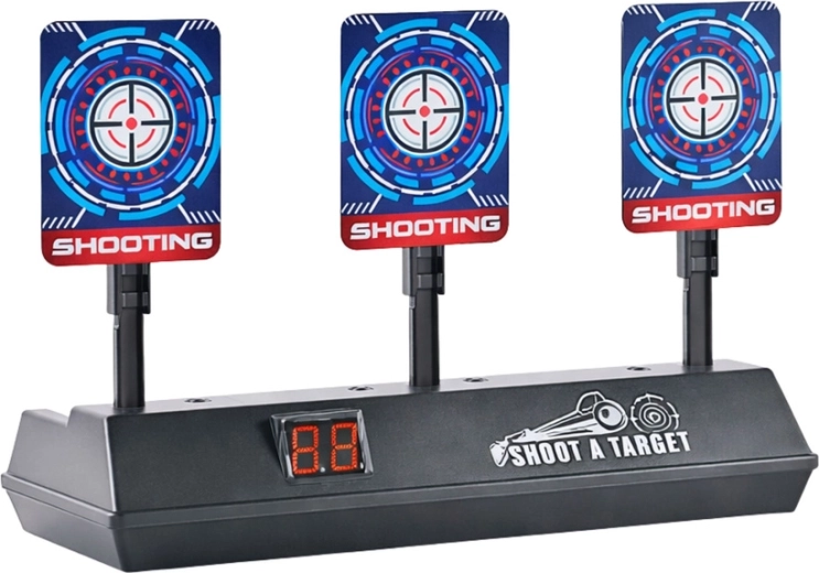 Ținta electronică de tragere pentru copii și adolescenți aduce jocuri pline de acțiune și antrenament al preciziei acasă și în aer liber. Trei ținte mobile cad la lovire, iar sistemul le ridică automat, astfel încât jocul continuă fără întreruperi. Contorul digital de puncte urmărește scorul, iar efectele luminoase și sonore (inclusiv aplauze după serii de lovituri) amplifică atmosfera. Practica plasă de protecție reține proiectilele din spumă și ușurează curățenia.