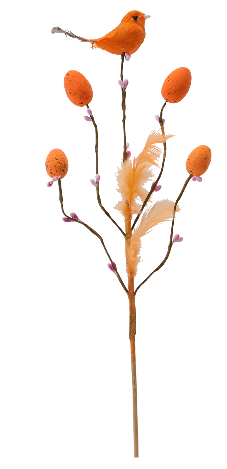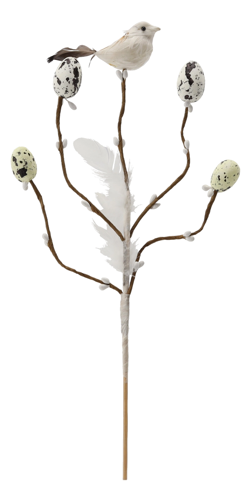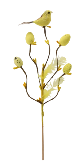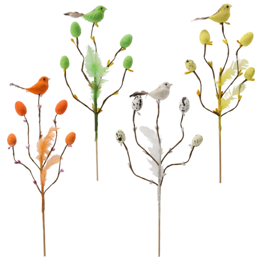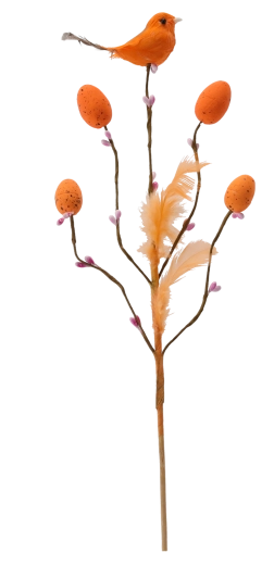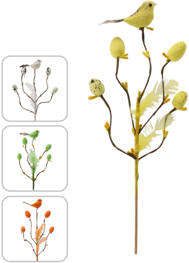 Această decorațiune de Paște stilată, pe țepușă, aduce în interior prospețimea și bucuria primăverii. Crenguța cu ramificații fine este completată de o păsărică, pene delicate și oușoare cu model punctat, care arată natural și jucăuș. Datorită tijei subțiri, o poți înfige ușor în aranjamente florale, decorațiuni cu mușchi sau o poți pune într-o vază îngustă.