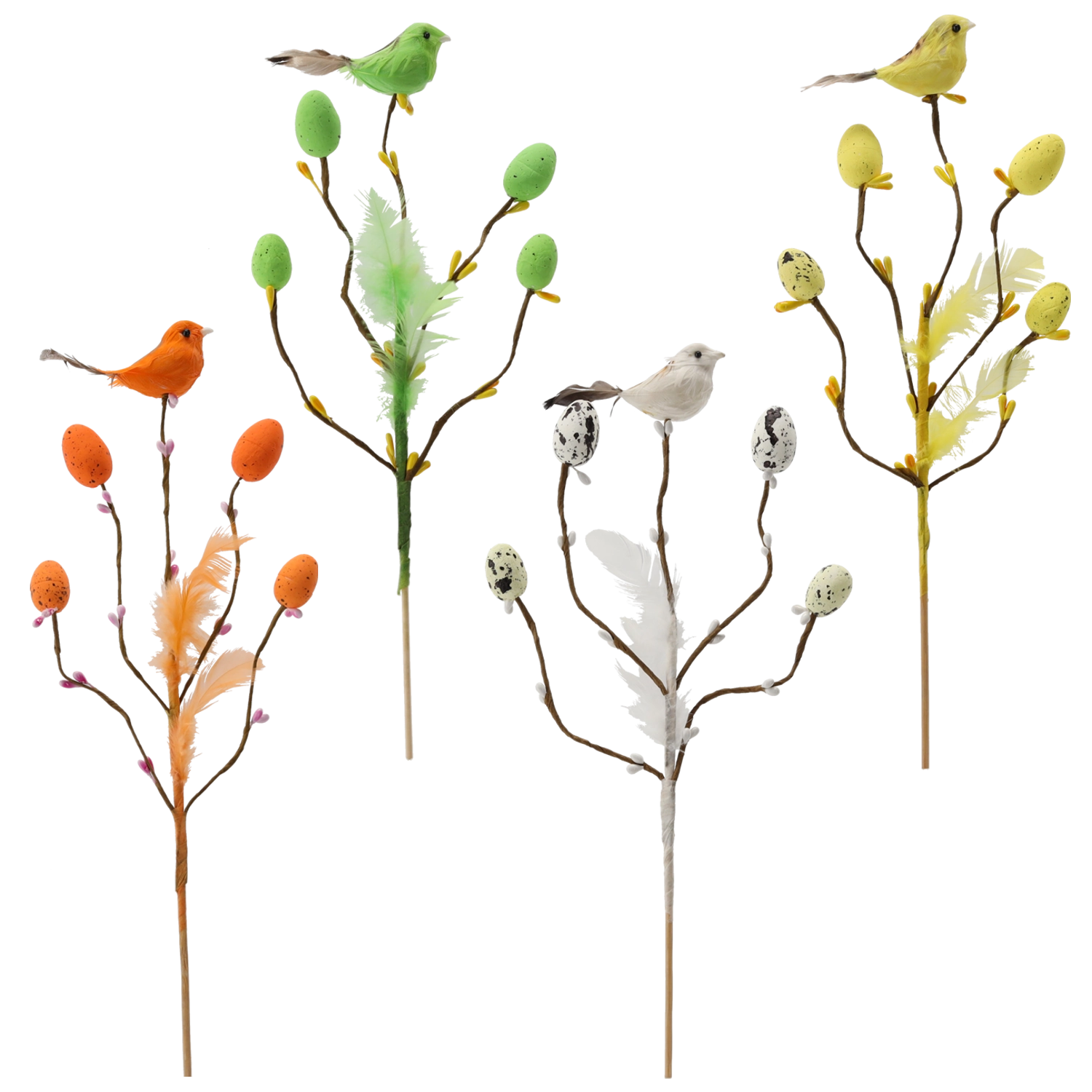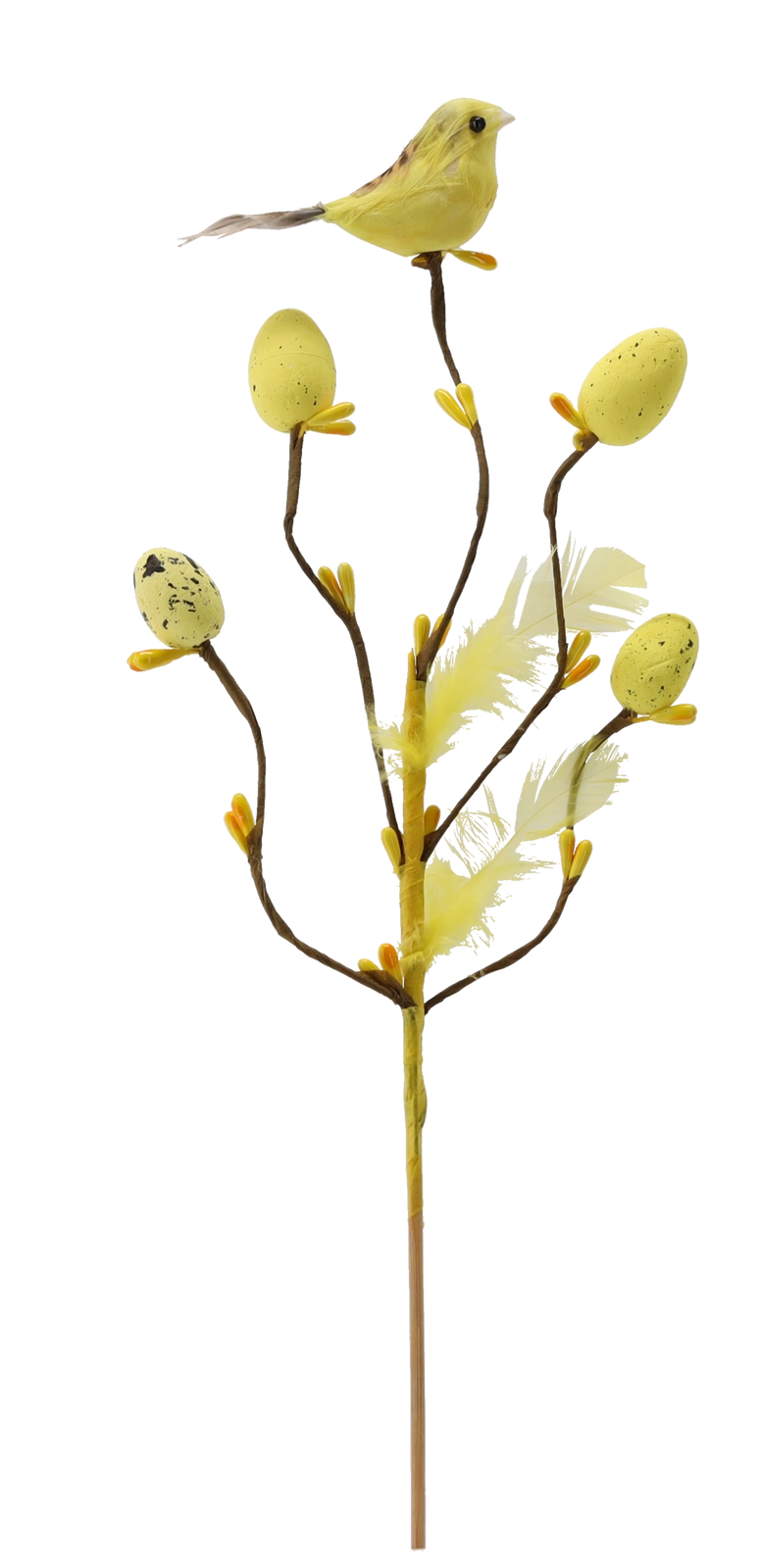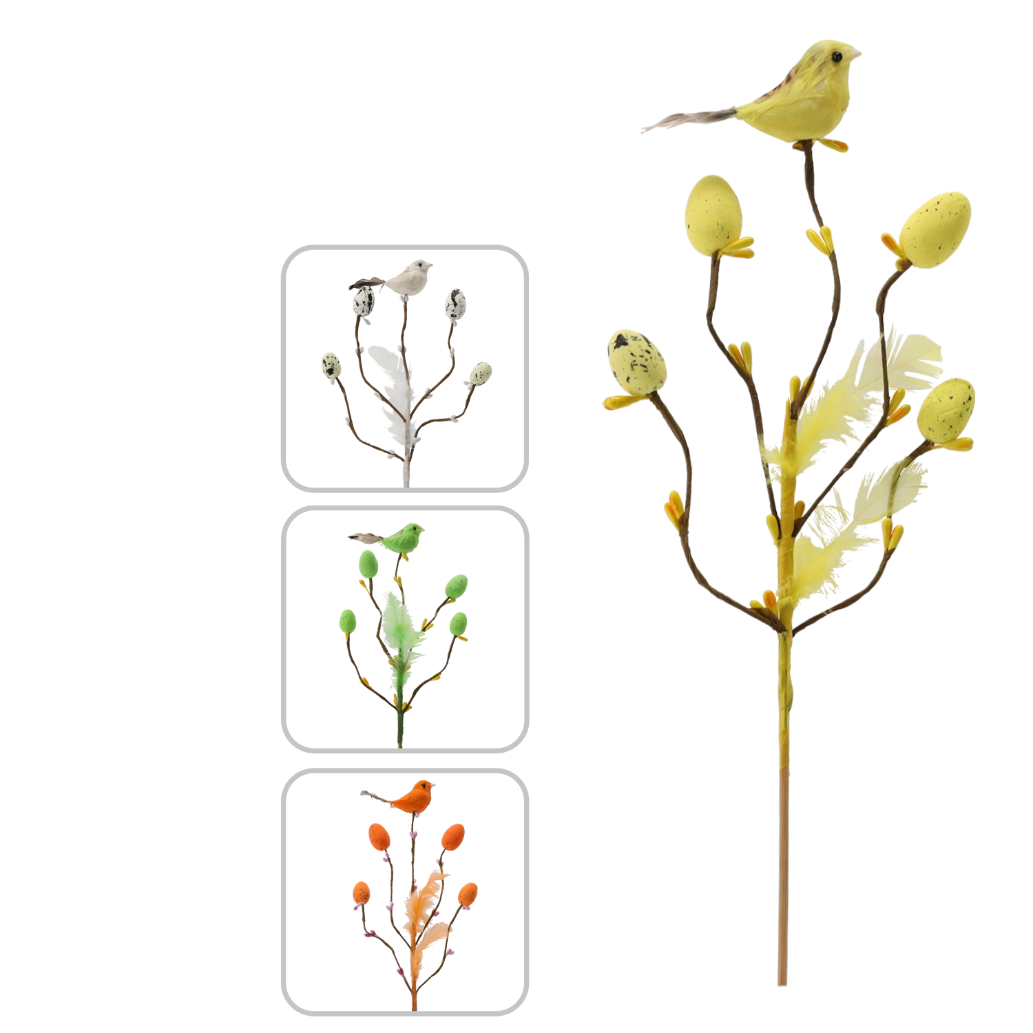 Această decorațiune de Paște stilată, pe țepușă, aduce în interior prospețimea și bucuria primăverii. Crenguța cu ramificații fine este completată de o păsărică, pene delicate și oușoare cu model punctat, care arată natural și jucăuș. Datorită tijei subțiri, o poți înfige ușor în aranjamente florale, decorațiuni cu mușchi sau o poți pune într-o vază îngustă.
