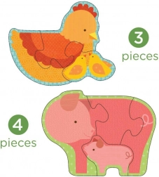 - Setul conține patru puzzle-uri diferite cu un număr de piese între 3 și 6, ceea ce face ușoară creșterea progresivă a dificultății.