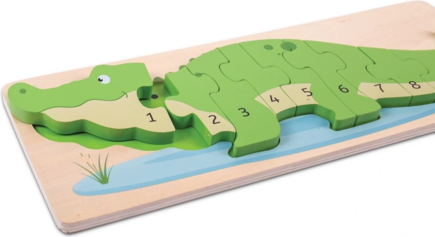 Puzzle colorat din lemn în formă de crocodil îi învață pe copii numerele 1–10 într-un mod jucăuș. 10 piese solide cu numere și indicatoare cu puncte sprijină numărarea, motricitatea fină, gândirea în relații și concentrarea. Fabricat din lemn de calitate, respectă standardele europene de siguranță.