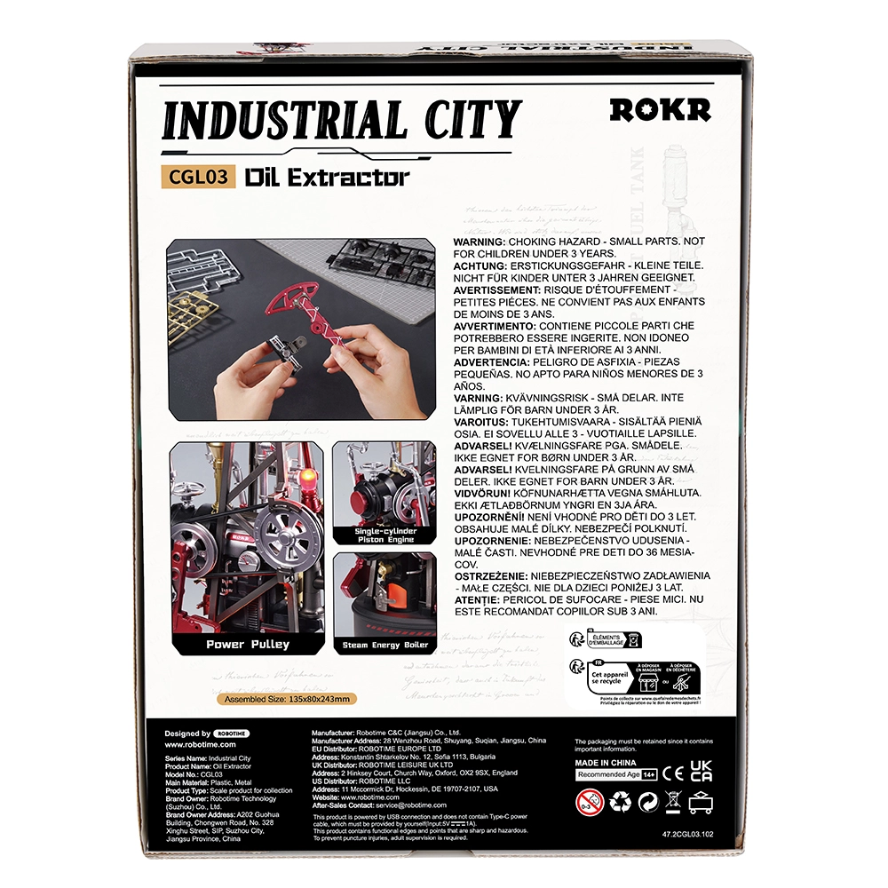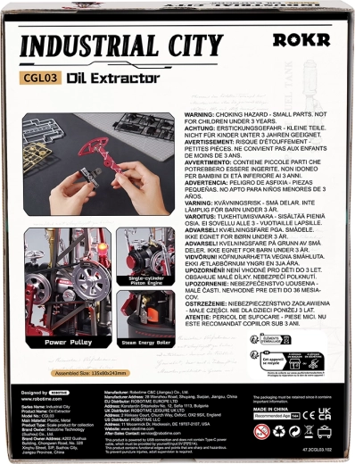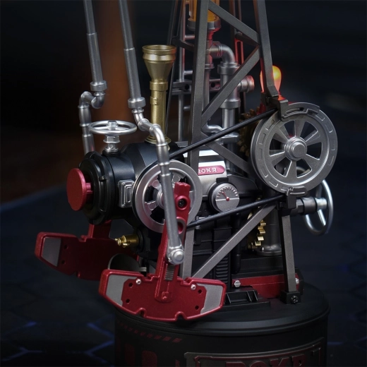 Acest puzzle mecanic, inspirat de utilajul istoric de extracție pumpjack, aduce tehnica direct pe biroul tău. Sistemul elaborat de roți dințate, mecanismul cu manivelă, contragreutatea și pistonul asigură o funcționare lină și autentică. Efectul LED din „cazanul cu aburi” simulează elegant arderea și accentuează atmosfera industrială.