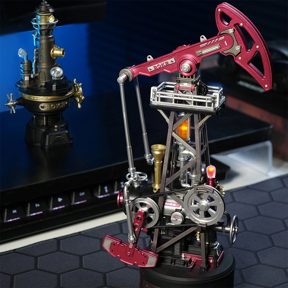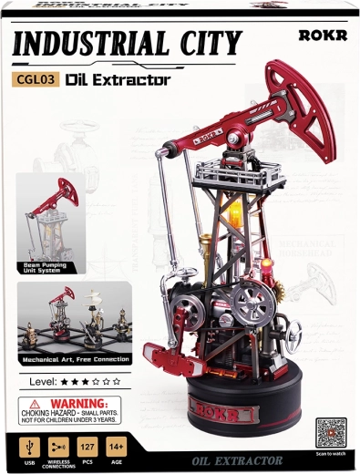 Pășește în lumea erei industriale cu un puzzle 3D detaliat al unei pompe de petrol, care oferă mișcare autentică oscilantă a brațului, angrenaje funcționale cu mecanism cu piston și spectaculoasă. Modelul în stil industrial este alimentat prin USB, are 127 de piese și dificultate medie, fiind ideal ca decorațiune, cadou și piesă de colecție pentru copii de la 14 ani și adulți.