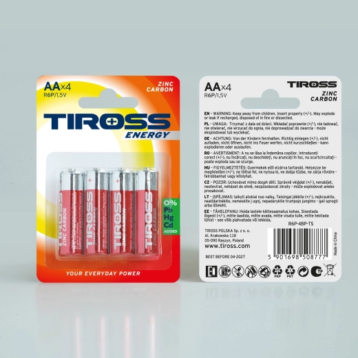 Baterii AA 1,5 V zinc-carbon fiabile pentru utilizare zilnică în dispozitive mai puțin solicitante. Pachetul de 4 bucăți asigură energie suficientă pentru telecomenzi, ceasuri deșteptătoare sau jucării, la un preț excelent.