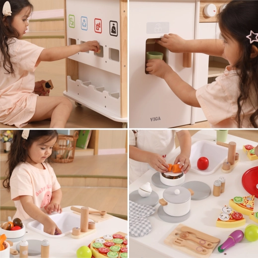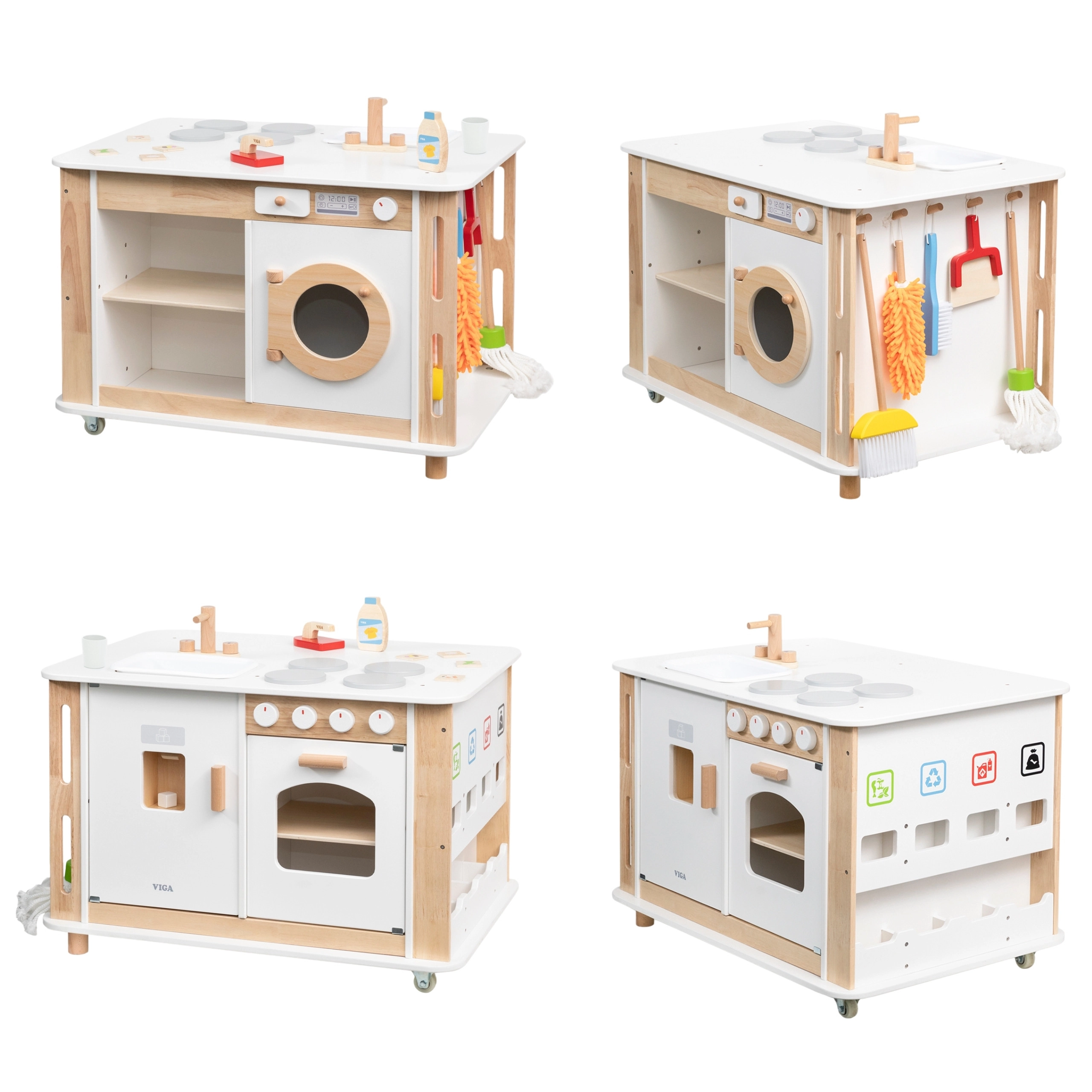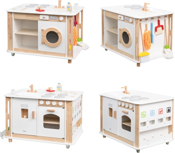 Acest centru domestic din lemn 3‑în‑1 Viga transformă camera copilului într-un mediu plin de activități care imită sarcinile zilnice. Copiii pot găti la plită cu butoane de control, pot coace în cuptor, pot „spăla” hainele, pot spăla vasele în chiuvetă și pot învăța să sorteze deșeurile cu ajutorul pieselor marcate colorat. Datorită celor două roți pivotante, întreaga stație se mută ușor și este ideală pentru joacă împreună.