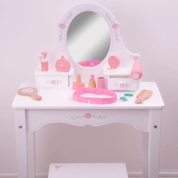 Adorabilul set din lemn cu 11 piese pentru jocul de-a salonul de frumusețe, în valiză portabilă, îi va încânta pe toți micii împătimiți ai cochetăriei de la 3 ani. Copiii se vor distra imitându-i pe adulți cu accesorii precum oglindă, pieptene, uscător de păr, ruj sau lac de unghii – dezvoltând în același timp creativitatea și motricitatea fină, precum și abilitățile sociale și de limbaj. Fabricat din materiale de calitate, sigure, conforme normelor europene.