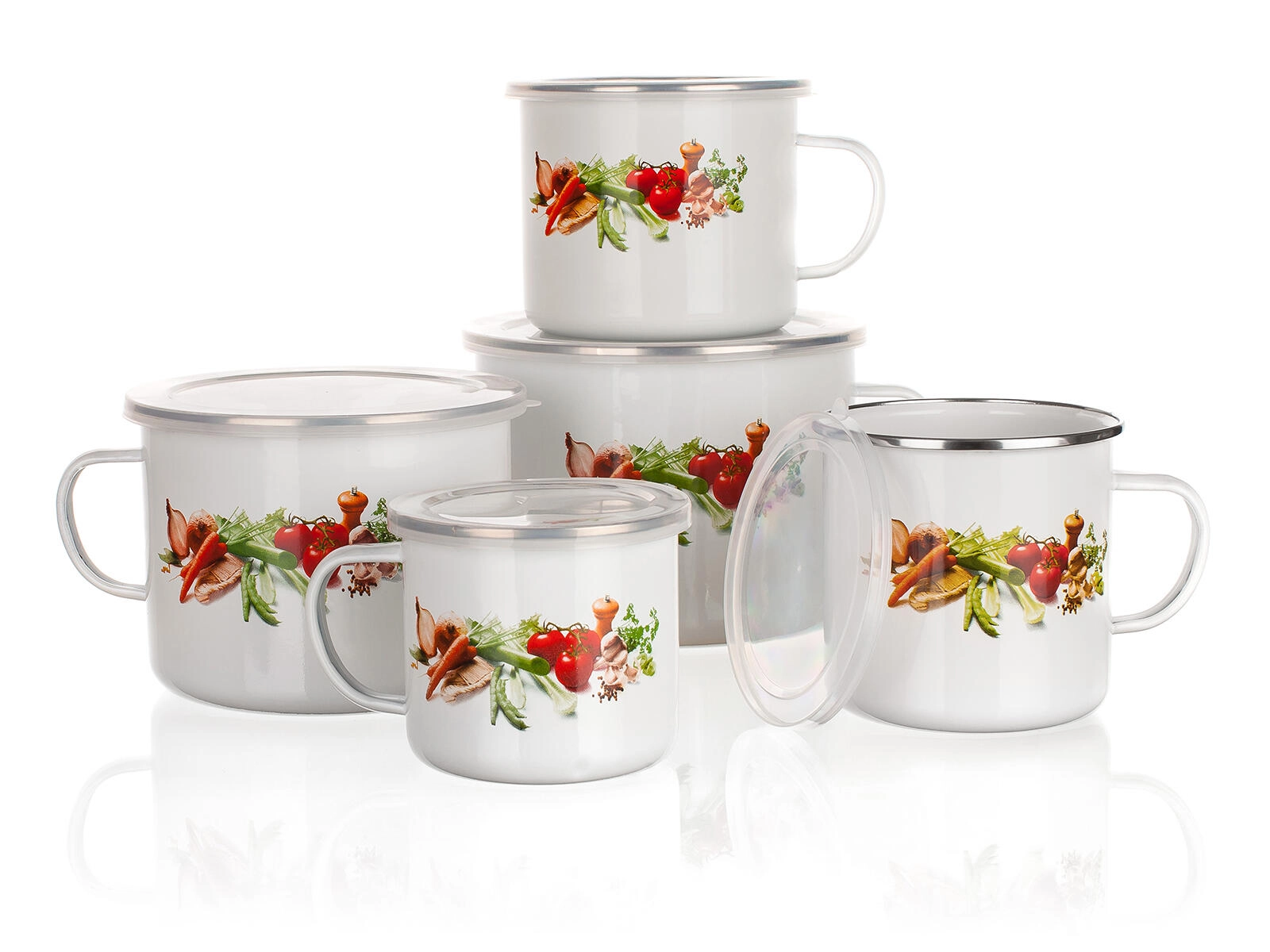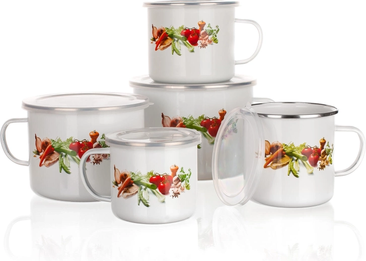 Cană emailată practică și ușoară, cu un volum de 0,7 l, decor cu legume și capac din plastic, ideală pentru ceai, cafea sau supă. Datorită emailului rezistent și posibilității de spălare în mașina de spălat vase, este o alegere excelentă pentru utilizarea zilnică acasă sau la cabană.