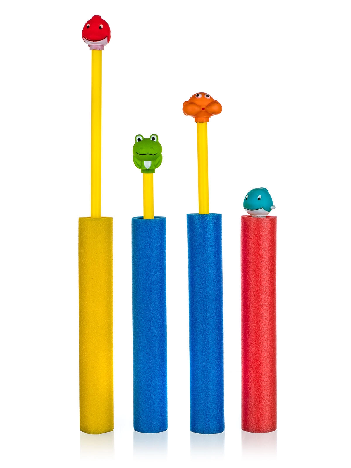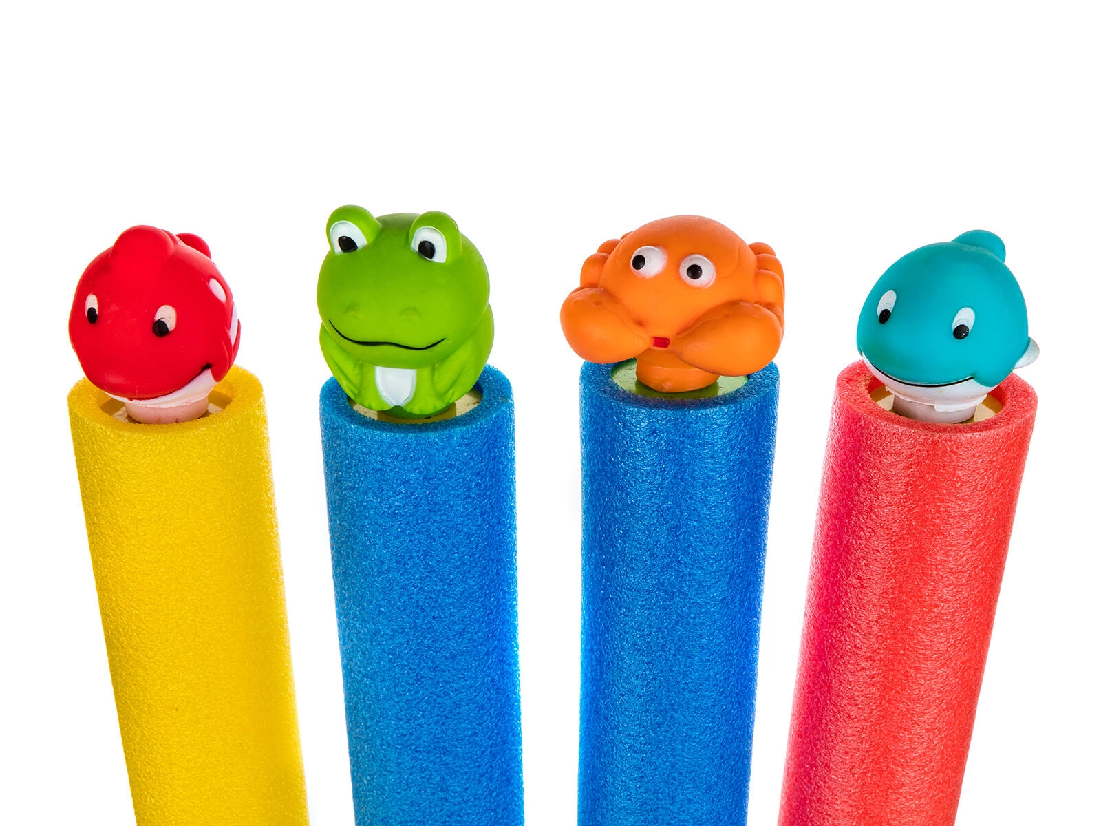 Pește, balenă, crab sau broscoi – căpșoarele colorate adaugă farmec jocului și ajută la deosebirea stropitoarelor între copii.