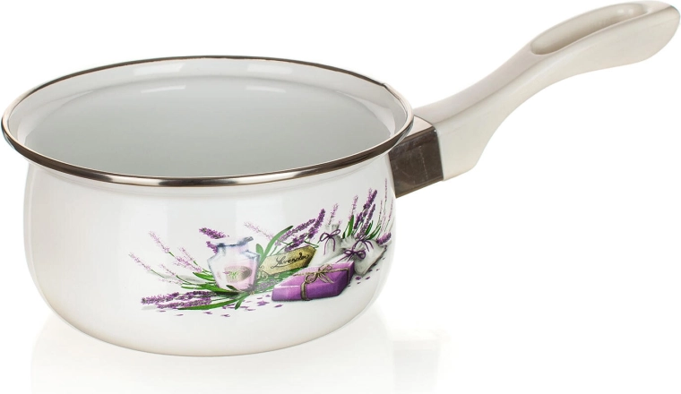 Crăticioara stilată, cu glazură albă și decor fin de lavandă, înfrumusețează orice bucătărie. Emailul de calitate asigură durată lungă de viață, întreținere ușoară și distribuție uniformă a căldurii. Mânerul ergonomic din bachelită este plăcut la atingere și rămâne rece.