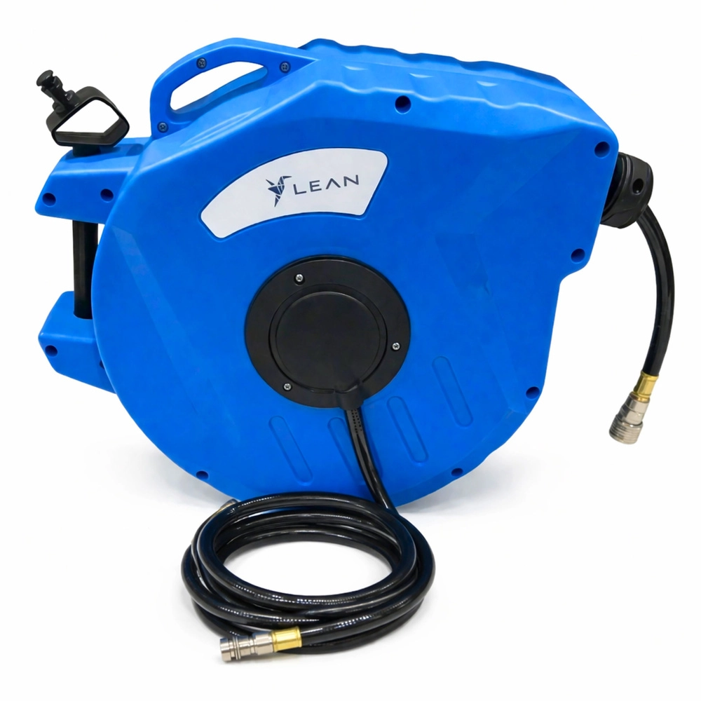 Păstrați locul de muncă ordonat și economisiți timp cu tamburul cu înfășurare automată. Carcasa robustă din plastic protejează mecanismul, sistemul de ghidare asigură derulare și înfășurare fluide, iar suportul pivotant ușurează lucrul în diferite direcții. Furtunul din PVC flexibil este potrivit pentru compresoare și scule pneumatice.