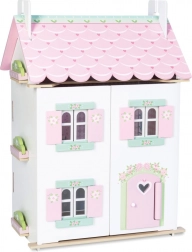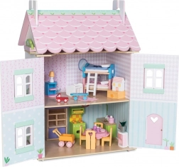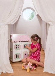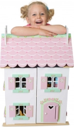 Căsuța pentru păpuși Sweetheart Cottage cucerește prin detalii – motive cu inimioare și flori, tonuri pastelate și compartimentare bine gândită. Partea frontală se deschide complet, oferind acces comod la toate camerele, iar ridicarea unei părți a acoperișului dezvăluie o mansardă primitoare.