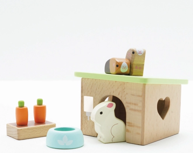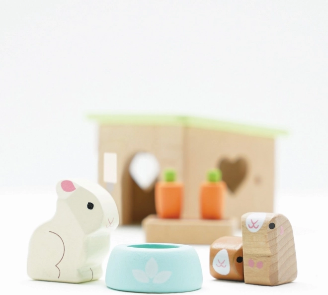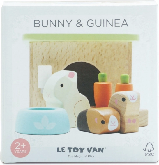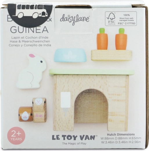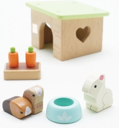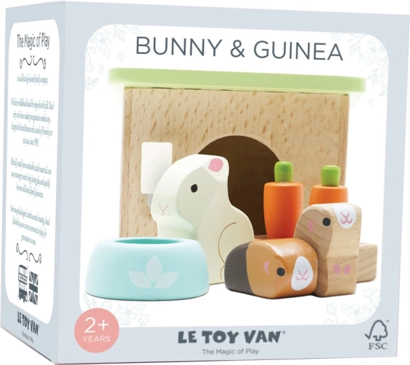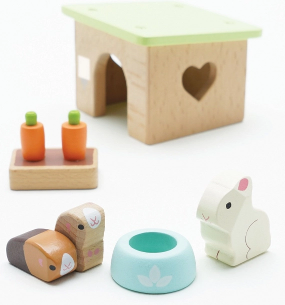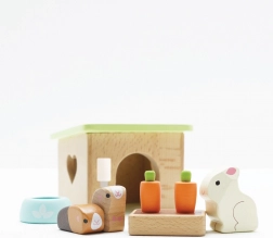 Setul adorabil din lemn cu animale de companie de la LE TOY VAN include un iepuraș, două cobai, un coteț, un bol și gustări de morcov pentru ore întregi de joc de rol creativ. Realizat din lemn sustenabil certificat FSC, finisat manual cu vopsele netoxice pe bază de apă – o alegere sigură și stilată pentru copiii de la 2 ani.