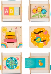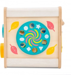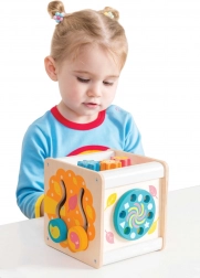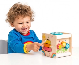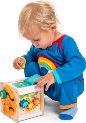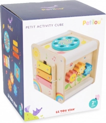 Cubul motoric vesel și educativ Le Toy Van Petilou din lemn natural cu elemente colorate susține jocul imaginativ și dezvoltarea abilităților cognitive la copii. Fabricat din lemn de cauciuc sustenabil și pictat cu vopsele netoxice, garantează o jucărie sigură și ecologică.