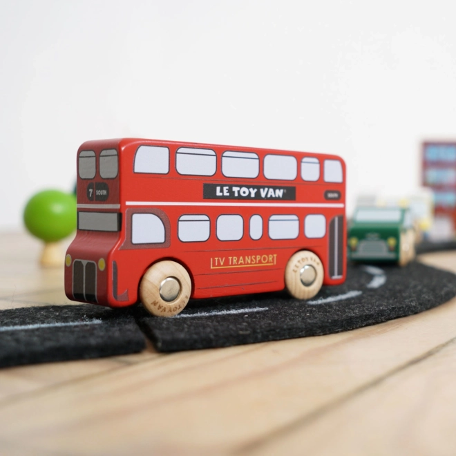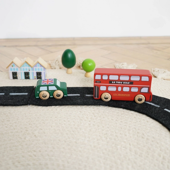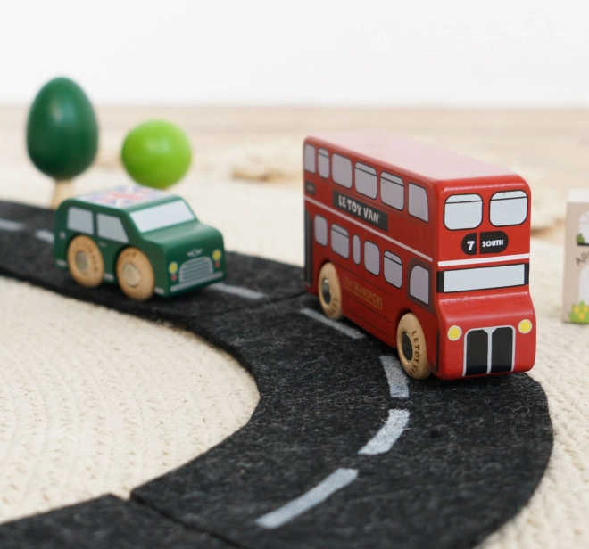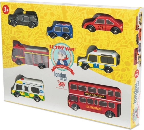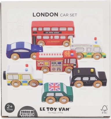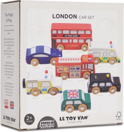 Descoperiți lumea străzilor aglomerate din Londra cu vehicule din lemn detaliate de la Le Toy Van. Setul include un autobuz etajat, un taxi negru, o mașină de pompieri, o ambulanță, o mașină de poliție și două autoturisme. Construcția robustă din lemn de cauciuc (hevea) sustenabil și marginile netede sunt ideale pentru mâinile mici ale copiilor, care își exersează prinderea, coordonarea mână–ochi și imaginația în timpul jocului.