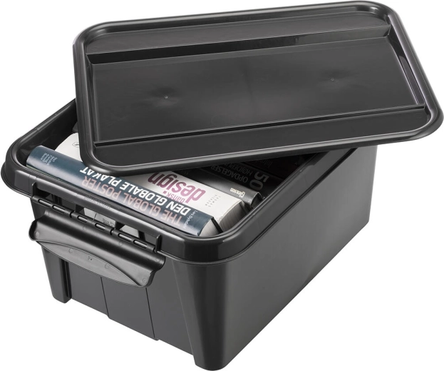 Păstrați ordinea cu o cutie de depozitare rezistentă din polipropilenă reciclată. Datorită volumului de 32 de litri și dimensiunilor 51 × 39 × 25,8 cm, găzduiește obiecte mici și medii. Capacul solid și 2 cleme robuste asigură o închidere sigură și protecția conținutului împotriva prafului.