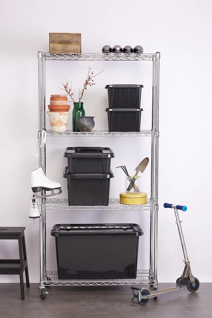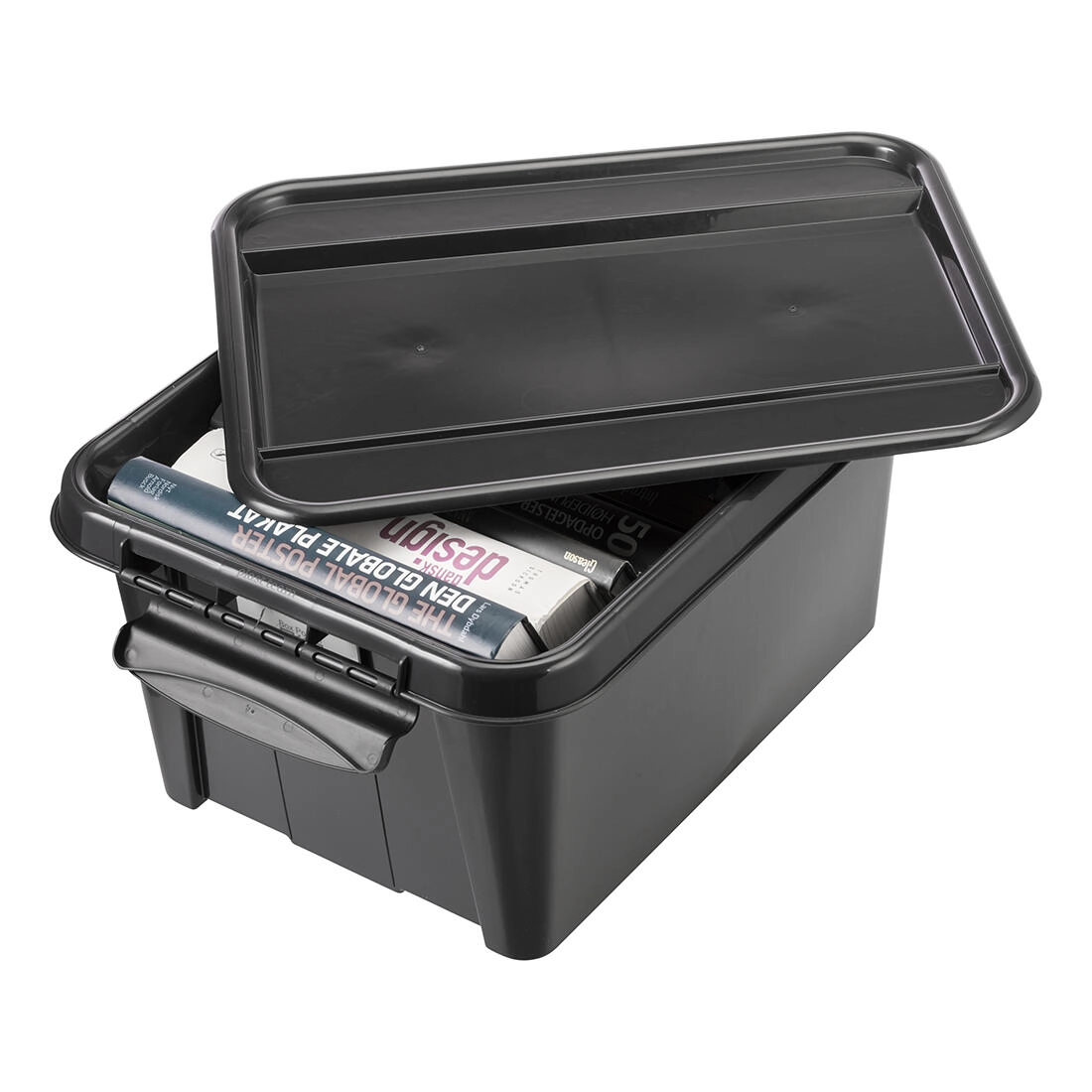 Cutie de depozitare practică, cu volum de 32 l, cu capac solid și două cleme mari pentru închidere sigură. Fabricată din PP reciclat, este rezistentă, stivuibilă și ideală pentru depozitare ordonată acasă, la birou sau în garaj.
