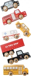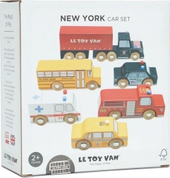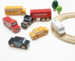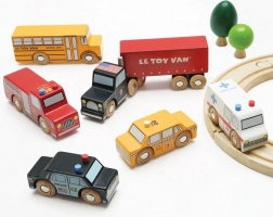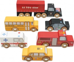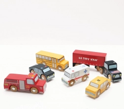 Această colecție colorată include un camion articulat cu zece roți, un autobuz școlar galben, o mașină de poliție, un taxi galben, o ambulanță și o mașină de pompieri. Detaliile atent lucrate și roțile care se rotesc lin îi invită pe copii la joc deschis, în care își construiesc povești și își antrenează coordonarea mână–ochi.