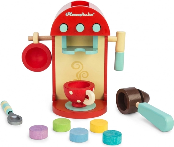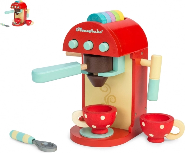 Acest espressor din lemn de calitate oferă copiilor o experiență autentică de preparare a cafelei. Capsule colorate pot fi introduse în pârghie pentru a „prepara” băutura direct în ceașca pictată, iar setul include spumator de lapte și linguriță. Capsule pot fi depozitate comod în orificiul din partea superioară a espressorului, astfel încât totul este la îndemână.