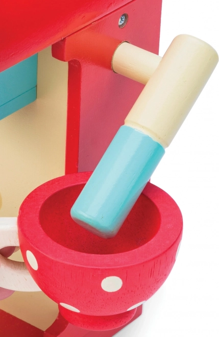Introduceți capsulele din lemn în pârghie, „turnați” cafeaua în ceașcă și jucați-vă de-a adevărații barista. Elementele interactive stimulează imaginația și motricitatea fină.