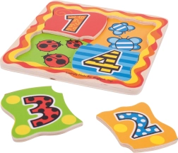 Acest puzzle din lemn cu numerele 1–4 de la Bigjigs Toys este o alegere excelentă pentru o primă familiarizare cu numerele. Piesele mari, solide, sunt ușor de ținut, iar culorile vii și detaliile jucăușe invită la încercări repetate și învățare prin joacă.