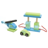 Designul este inspirat de garajele tradiționale și include 2 rampe, lift funcțional, heliport, pompă de benzină, o mașinuță și un elicopter. Este realizată din lemn de arbore de cauciuc durabil și sustenabil.
