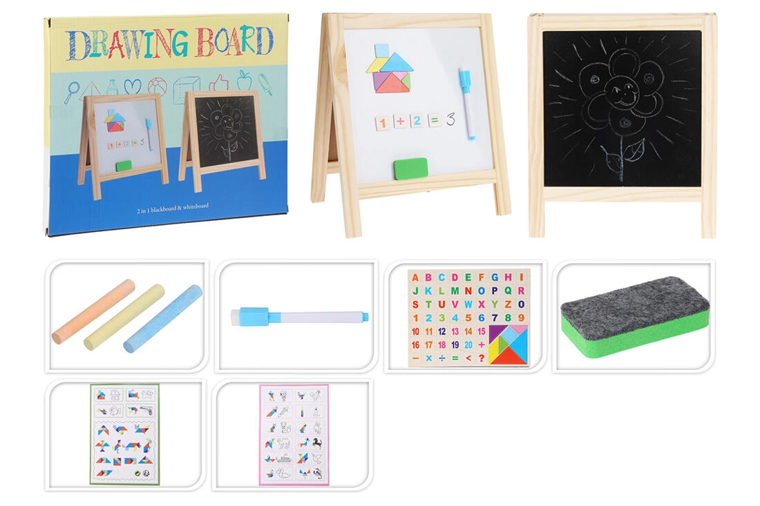 Această tablă cu două fețe este ideală pentru dezvoltarea creativității, a motricității fine și a primelor abilități școlare. Partea albă magnetică este potrivită pentru scriere cu markerul și pentru lucrul cu litere magnetice, în timp ce partea neagră pentru cretă este destinată desenului cu cretă. Datorită suportului stabil din lemn, se folosește ușor pe birou sau pe raft.