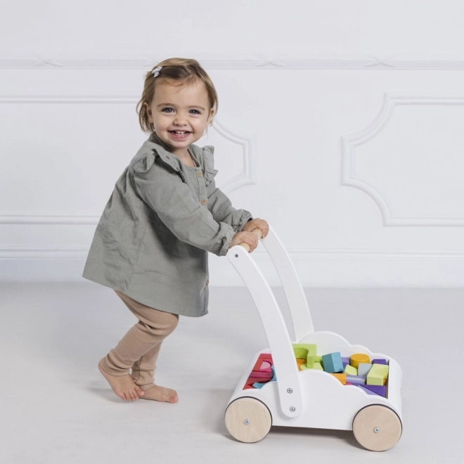 Căruciorul include 45 de cuburi colorate, care susțin creativitatea și dezvoltarea abilităților motorii.