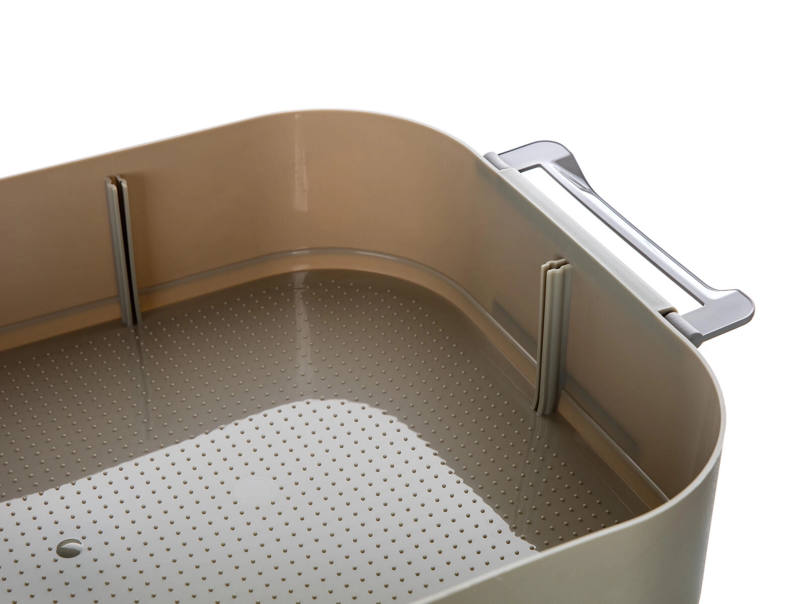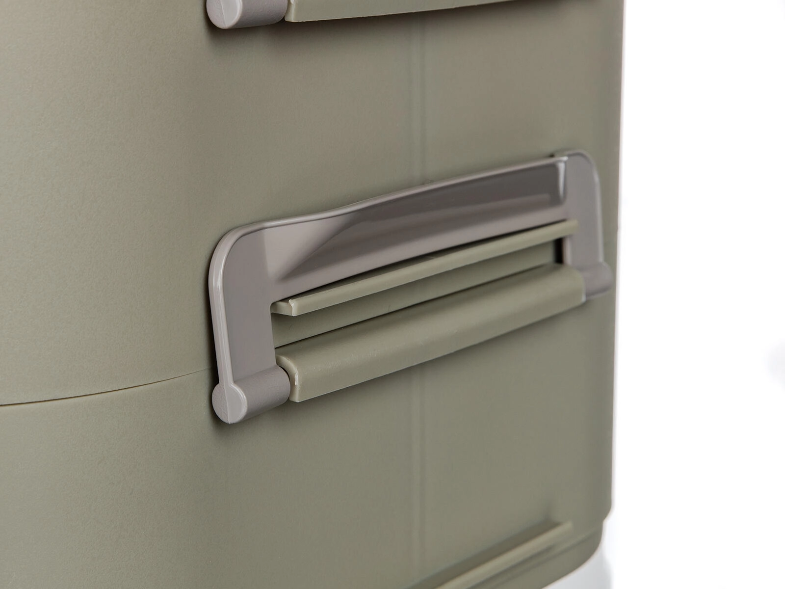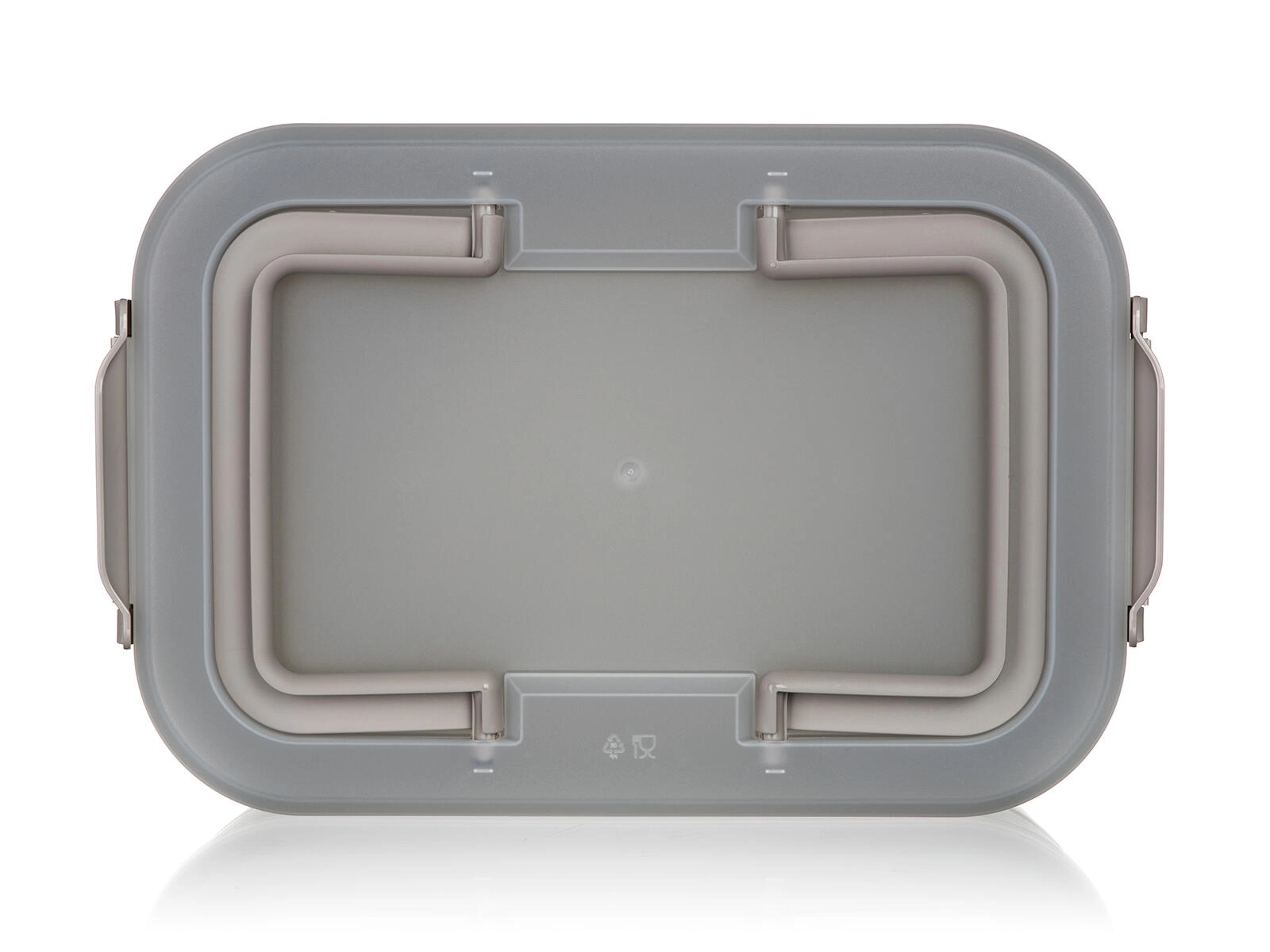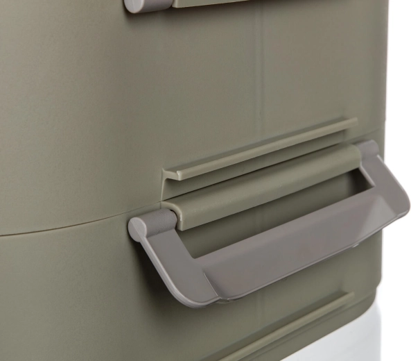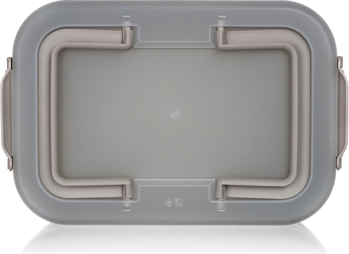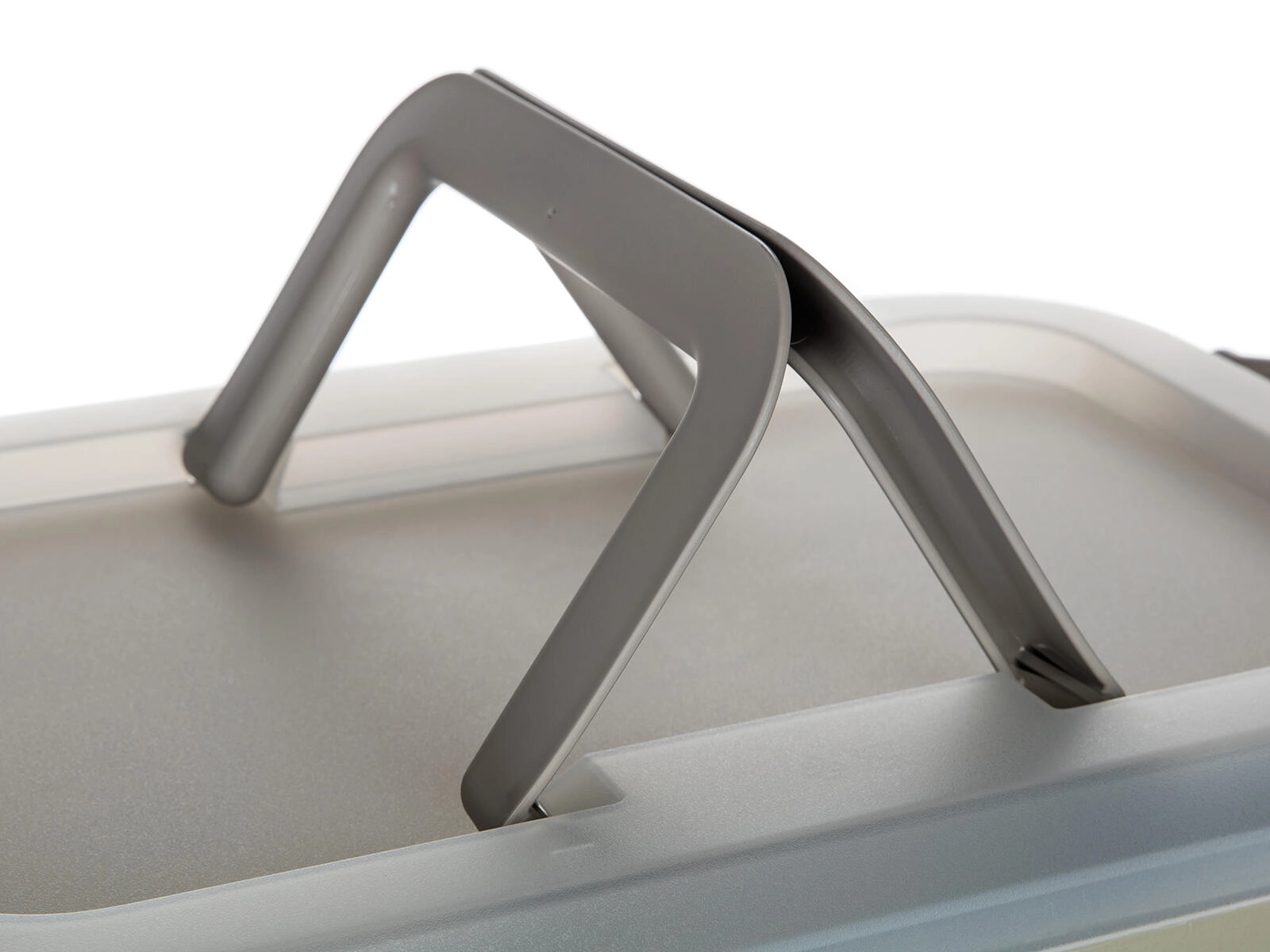 Mânerul integrat în capac asigură o priză sigură și stabilitate la purtare, iar când nu este necesar, se pliază cu ușurință.