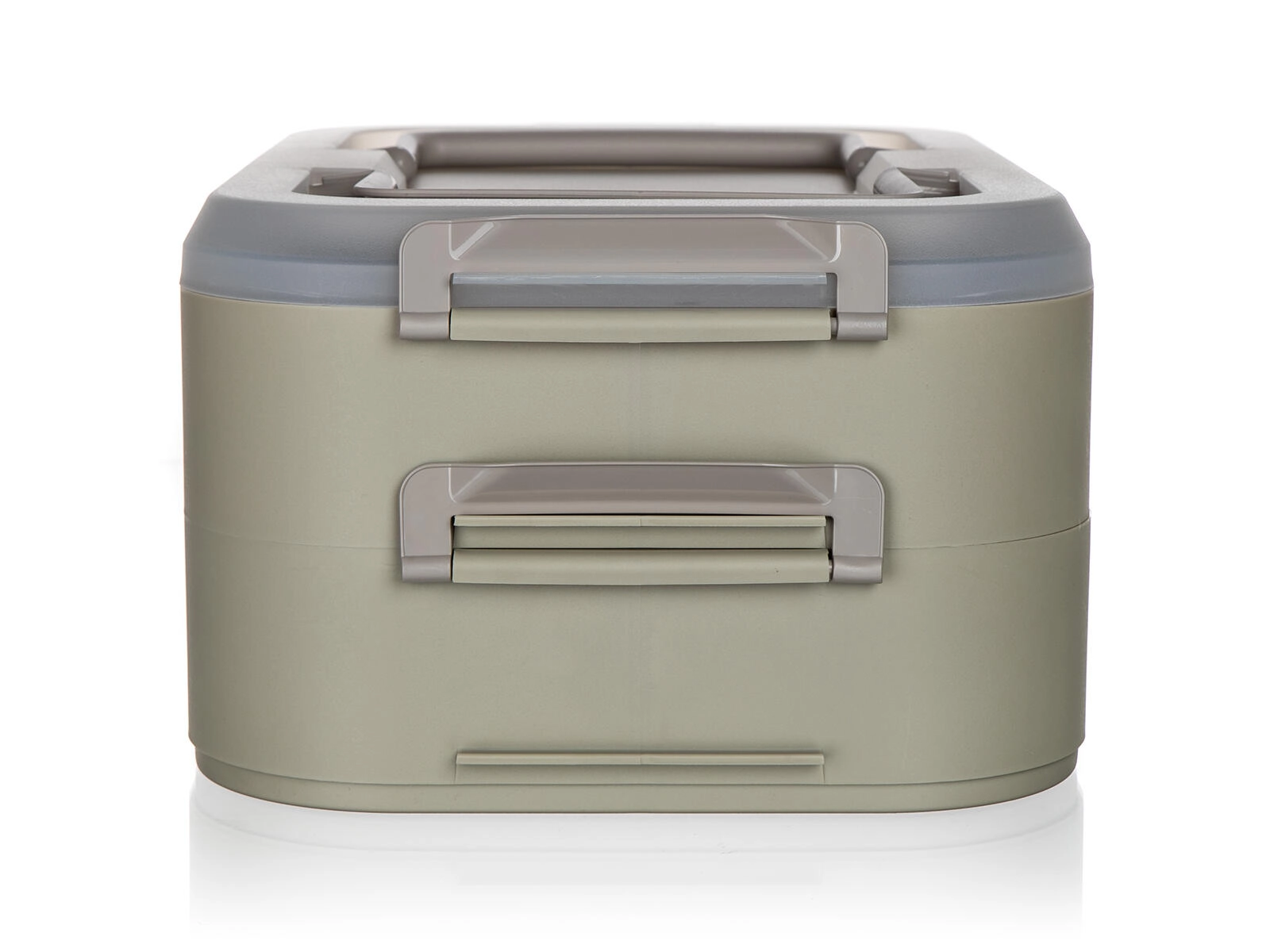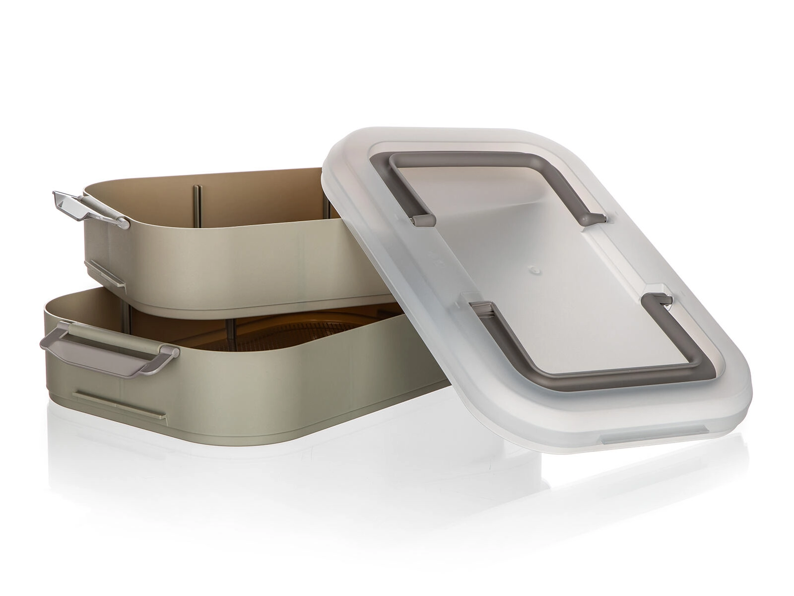 Separați preparatele dulci de cele sărate, produsele de patiserie sau garniturile. Cele două tăvi suprapuse oferă ordine și vizibilitate fără amestecarea gusturilor.