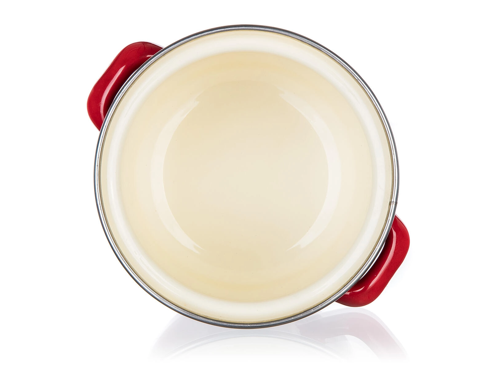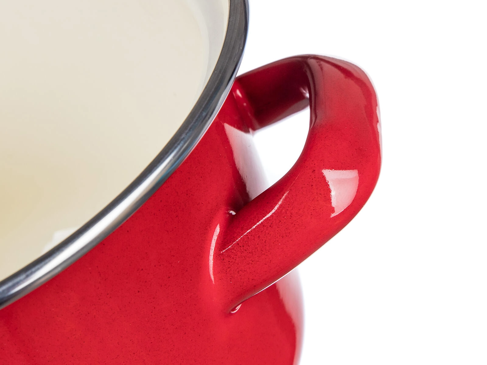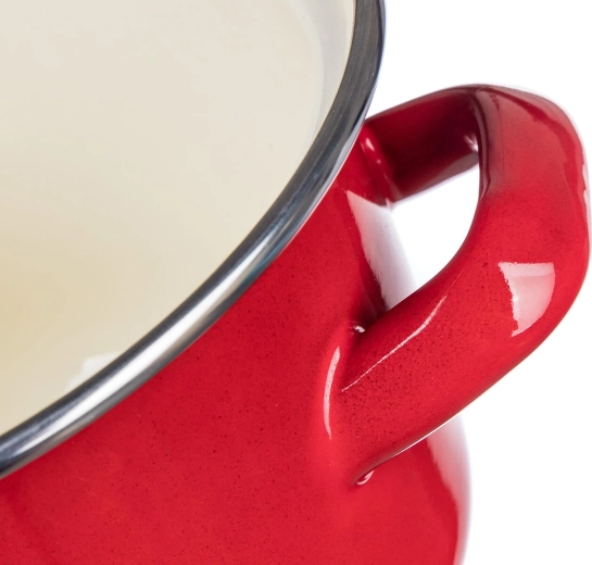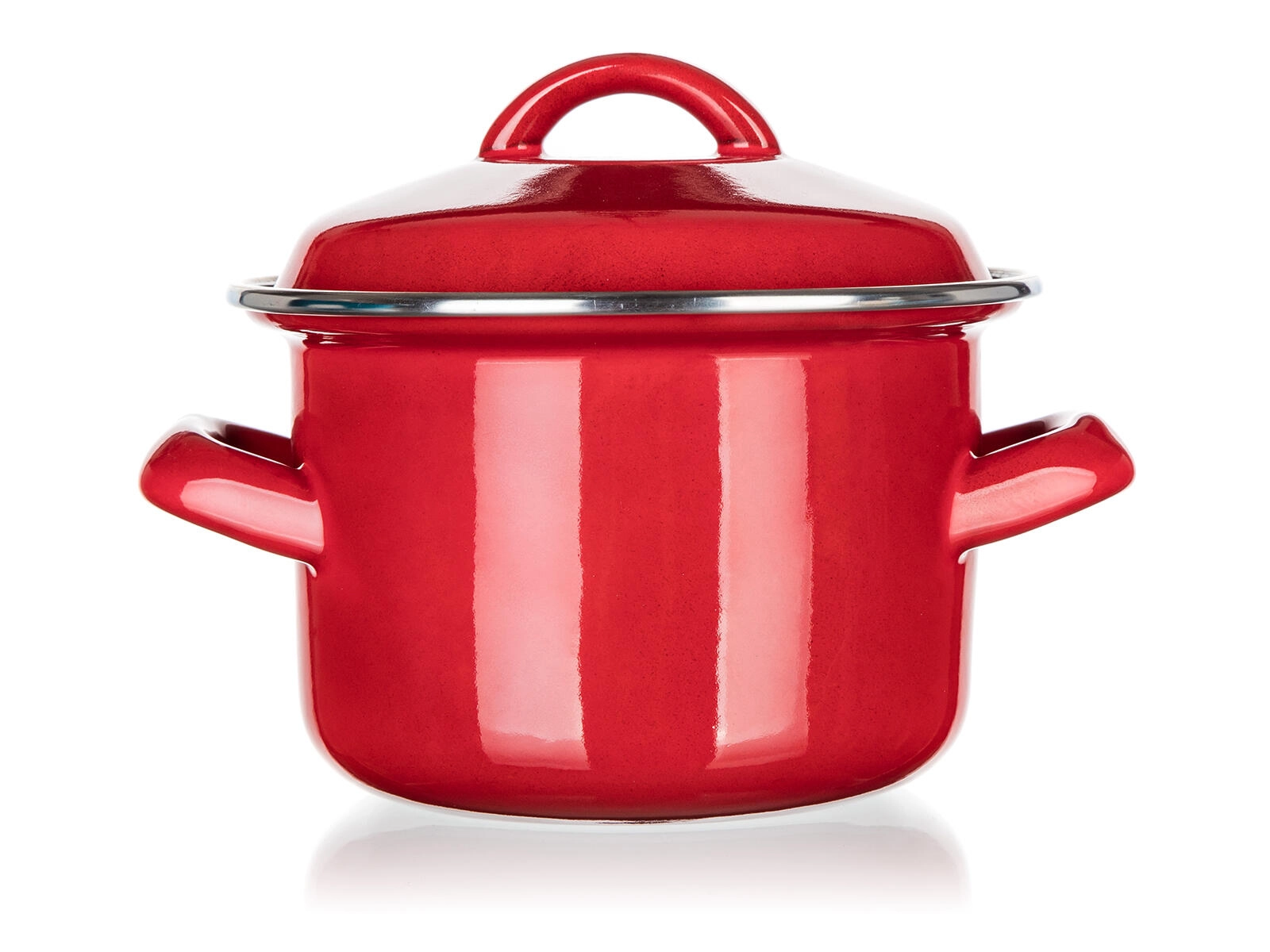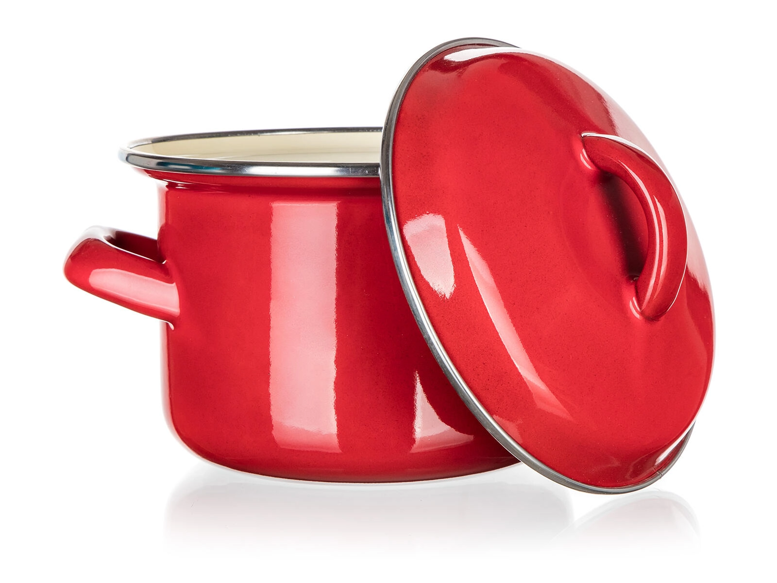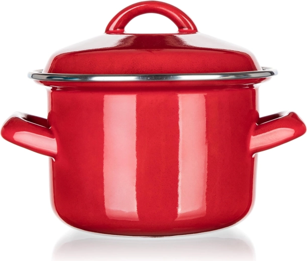 Oală compactă emailată cu capac, cu un volum de 0,78 l și diametru de 12 cm, ideală pentru porții mici, sosuri sau reîncălzire. Smalțul emailat durabil în culoare roșie, interiorul crem și baza universală pentru toate tipurile de plite, inclusiv inducție asigură gătire ușoară și durată lungă de viață.