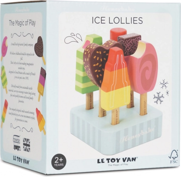 Setul colorat de șase înghețate pe băț din lemn LE TOY VAN din colecția Honeybake aduce joc imaginativ fantastic și distracție în siguranță. Datorită lemnului FSC durabil, vopselelor netoxice pe bază de apă și suportului inclus, este ideal pentru bucătării de jucărie și standuri de înghețată. Susține motricitatea fină, creativitatea și abilitățile cognitive.