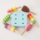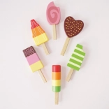 Șase înghețate din lemn pictate unic, cu culori și forme vesele, stimulează imaginația și invită la jocul nesfârșit de vânzător de înghețată.