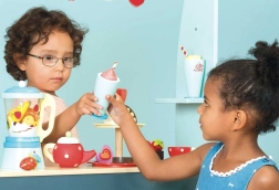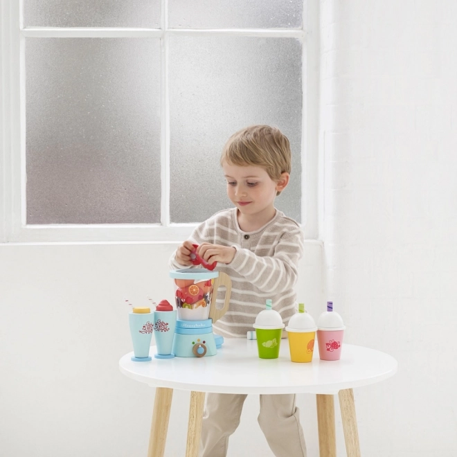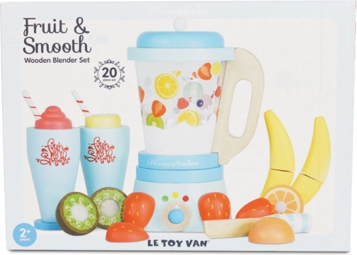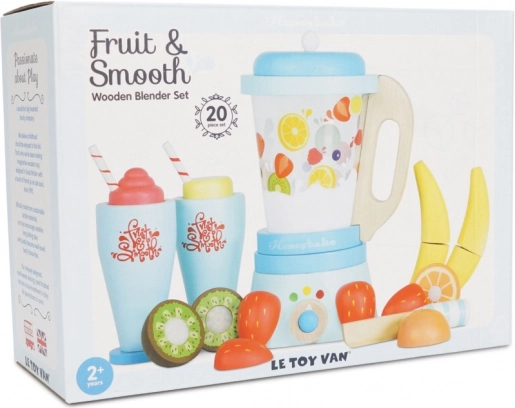 Amestecă-le copiilor o porție sănătoasă de distracție cu blenderul pentru smoothie din lemn LE TOY VAN. Setul include un blender clasic cu recipient detașabil, 6 bucăți de fructe de tăiat cu scai, un cuțitaș din lemn și 2 pahare cu pai. Fabricat din lemn certificat FSC, pictat manual cu vopsele netoxice pe bază de apă și premiat pentru calitate și valoare educativă în joc.