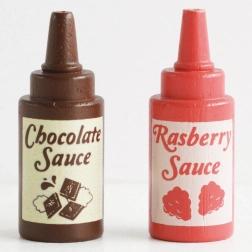 - Conținutul pachetului: cornete și pahar, cupe de înghețată, 2 sosuri (zmeură, ciocolată), toppinguri și linguriță – în total 7 piese.
