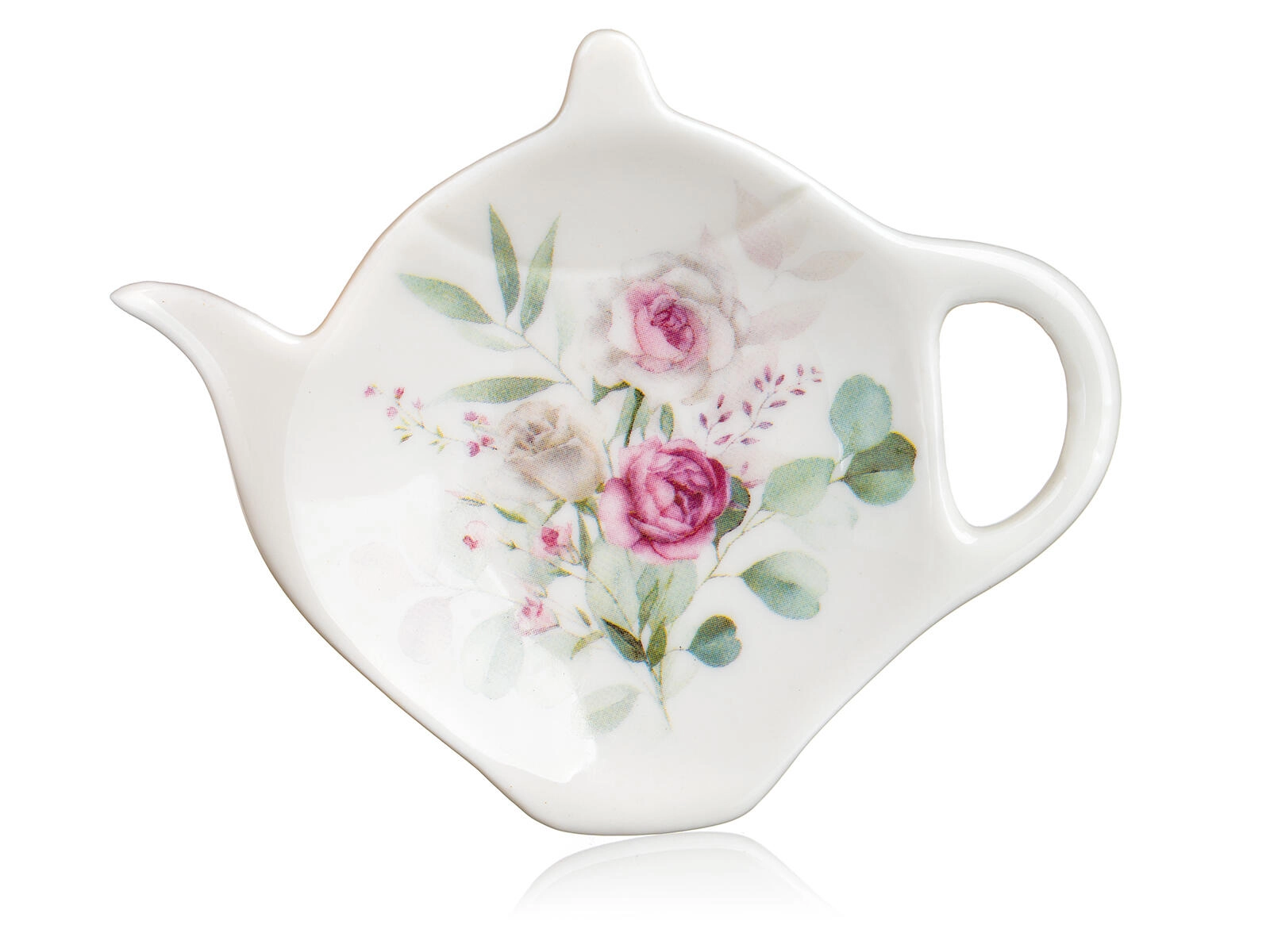 Tăviță mică, practică, în formă de ceainic, pentru a așeza sita după infuzare. Menține suprafața de lucru curată și se asortează cu decorul floral al cănii.